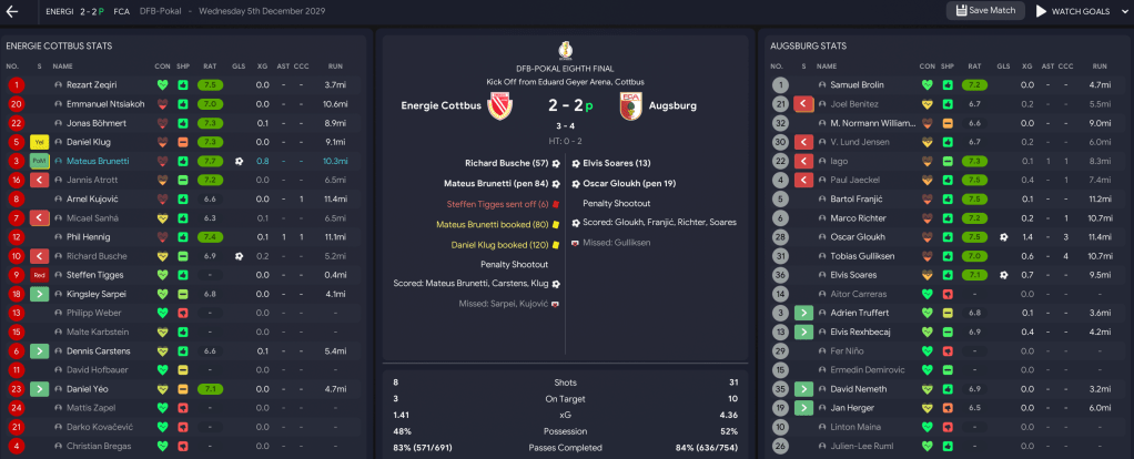 Another 2. Bundesliga side followed as they hosted Augsburg in the “Eighth Final,” or last 16 to normal people. And they again gave it a really good go, even after Tigges was very harshly sent off after just six minutes. Augsburg raced into a 2-0 lead through a penalty that was as dodgy as the sending-off, but Prusseit rallied his troops and they fought back to earn a 2-2 through Busche and Bonetti’s late penalty. But their luck ran out in a penalty shootout, losing it 4-3 on spot kicks with Kujovic missing their sixth.