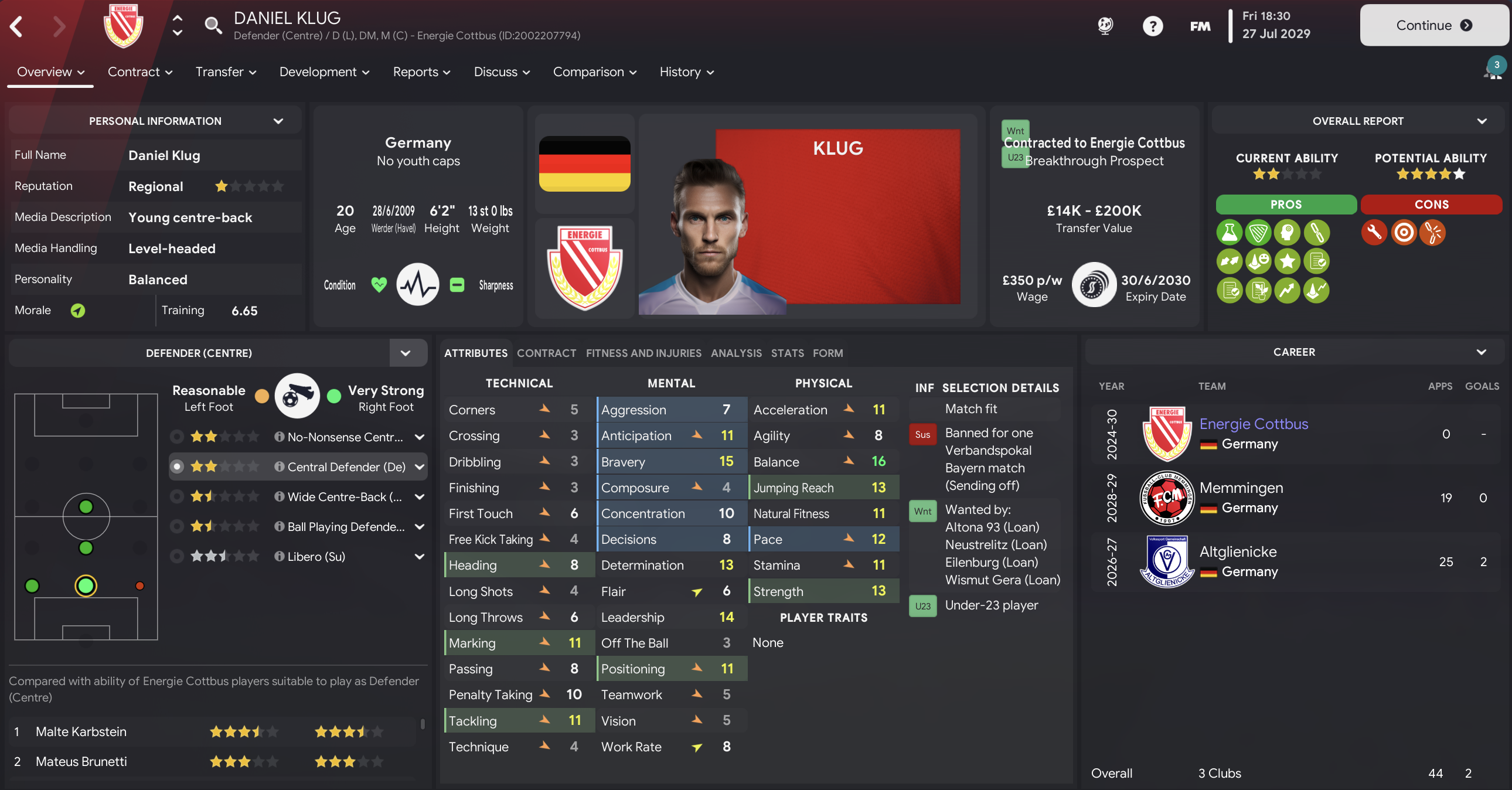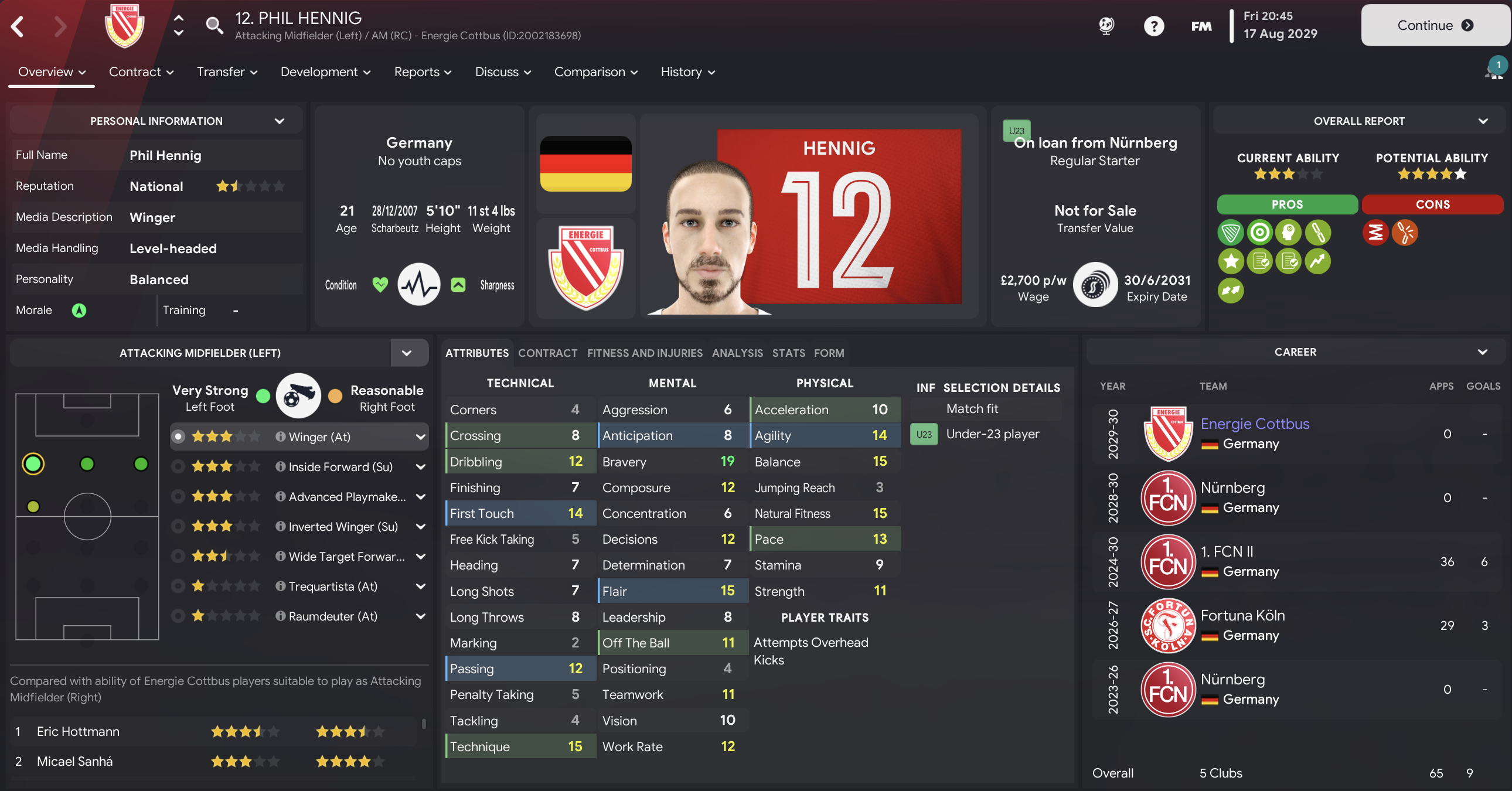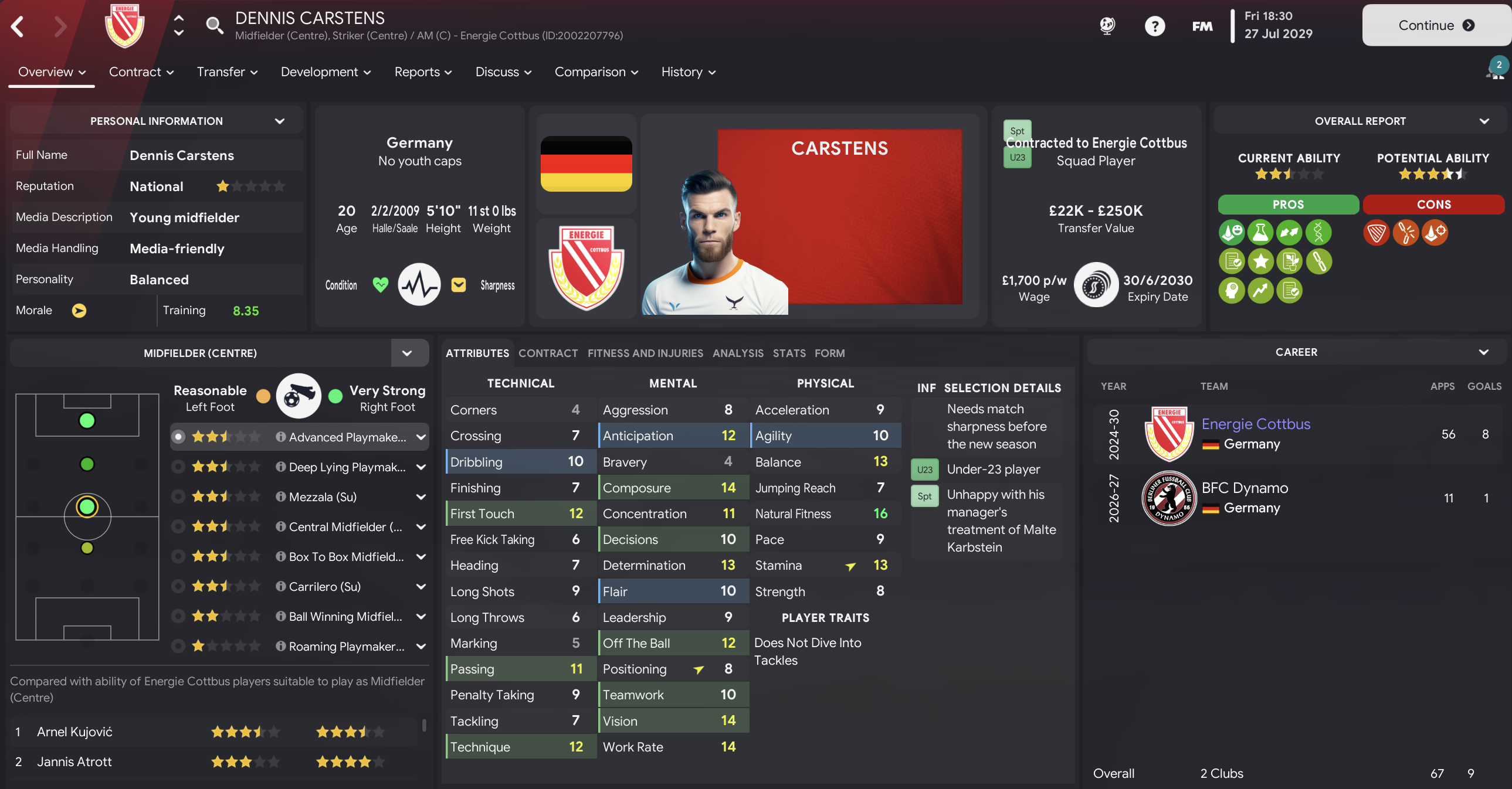 The best player remaining at the club was Tigges, who’s considered a good 3. Liga player. Other key players include winger Micael Sanhá, midfielder Arnel Kujovic, Prusseit’s first Brazilian player left-back Mateus Brunetti and centre-back Malte Karbstein. There was also plenty of potential as six players had at least 4.5-star potential led by centre-back Daniel Klug, midfielder Daniel Yéo and midfielder/striker Dennis Carstens. And the quality in the squad was boosted by loaning in winger Phil Hennig and free transfers of right-back Emmanuel Ntsiakoh and promising striker Richard Busche.