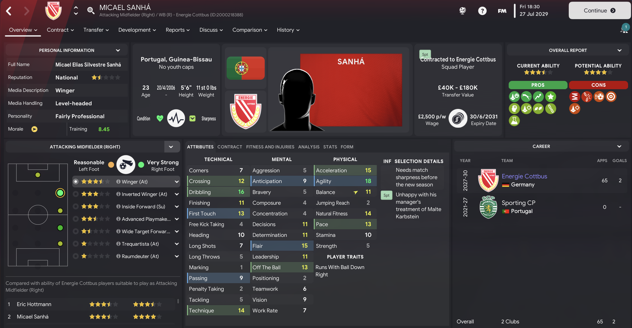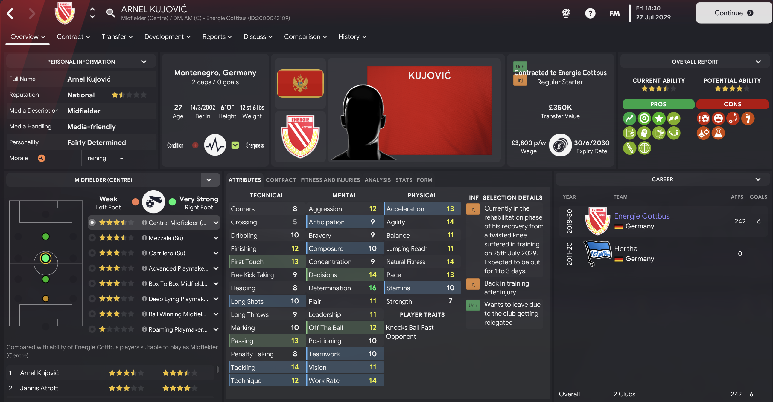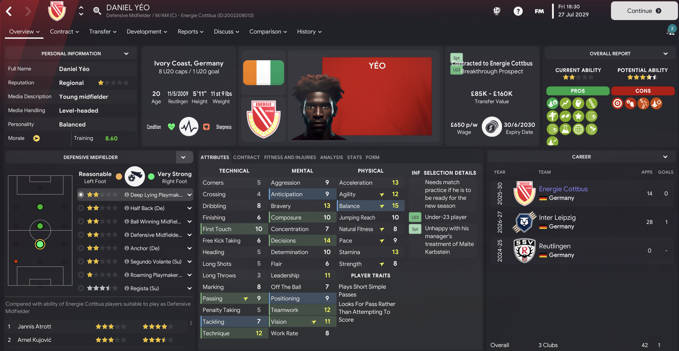 The best player remaining at the club was Tigges, who’s considered a good 3. Liga player. Other key players include winger Micael Sanhá, midfielder Arnel Kujovic, Prusseit’s first Brazilian player left-back Mateus Brunetti and centre-back Malte Karbstein. There was also plenty of potential as six players had at least 4.5-star potential led by centre-back Daniel Klug, midfielder Daniel Yéo and midfielder/striker Dennis Carstens. And the quality in the squad was boosted by loaning in winger Phil Hennig and free transfers of right-back Emmanuel Ntsiakoh and promising striker Richard Busche.