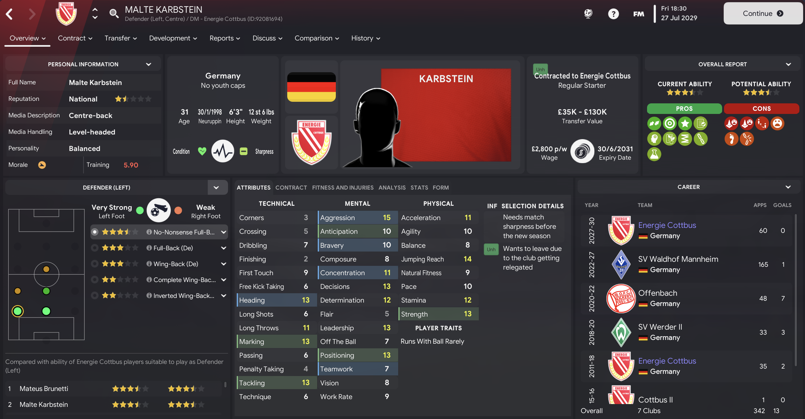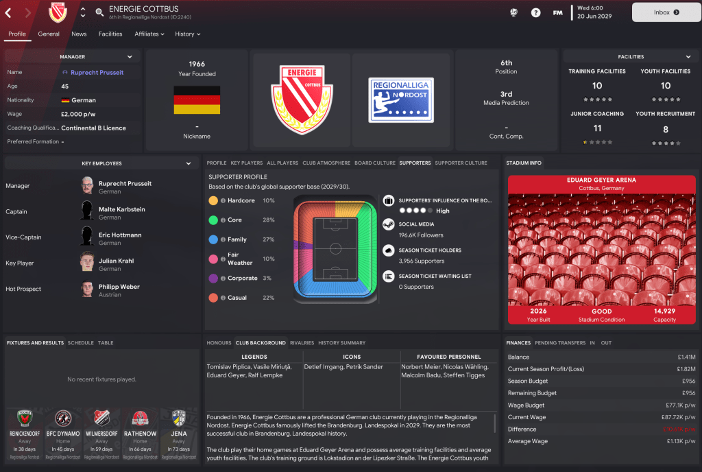 In this save, Cottbus spent the first three seasons in tier four before two consecutive promotions up to 2. Bundesliga then back-to-back relegations take them back into Regionalliga Nordost for the 2029/2030 campaign.