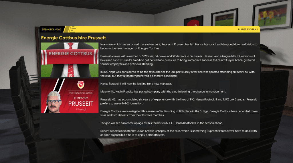 However, Prusseit felt his career would be best off at a club that wasn’t a B Team, which didn’t give him any control over actual club management and offered limited opportunities. No jobs were available at the start of the summer, so he was settled on staying in Rostock. But he soon received an invitation to an interview from Energie Cottbus, who’d just been relegated from 3. Liga, after having to reject an interview offer from Bundesliga side Augsburg.