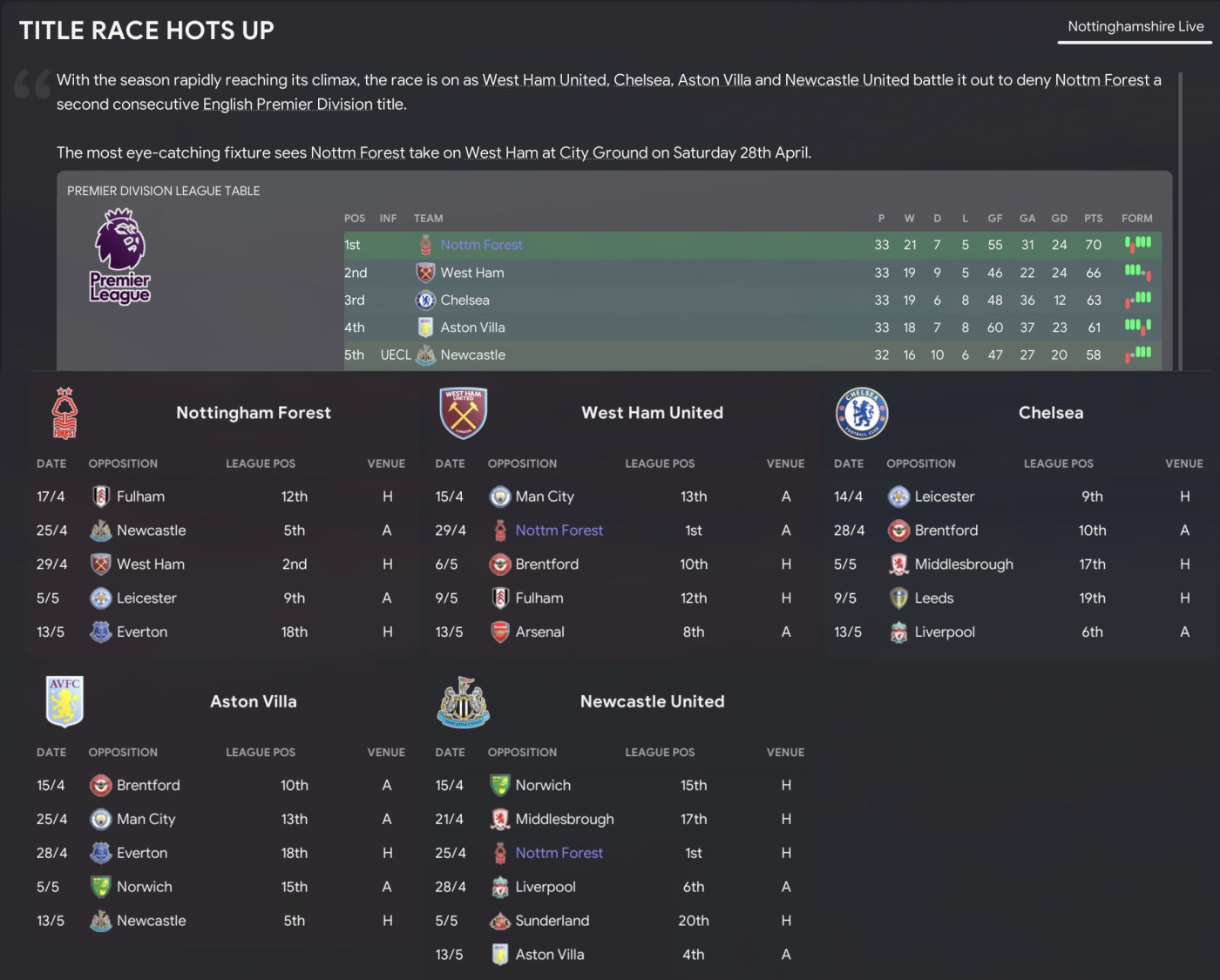 West Ham had two games in hand but lost both, leaving us four points clear going into the final five games of our title defence. And the top five looked somewhat unusual going into the final days of the title race.