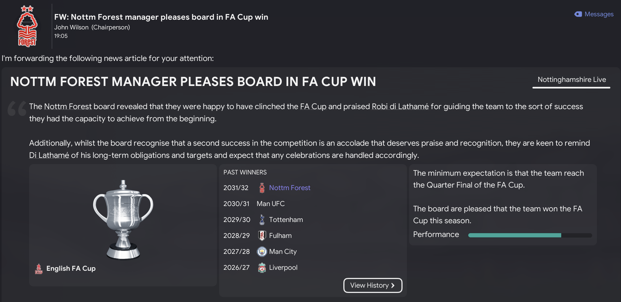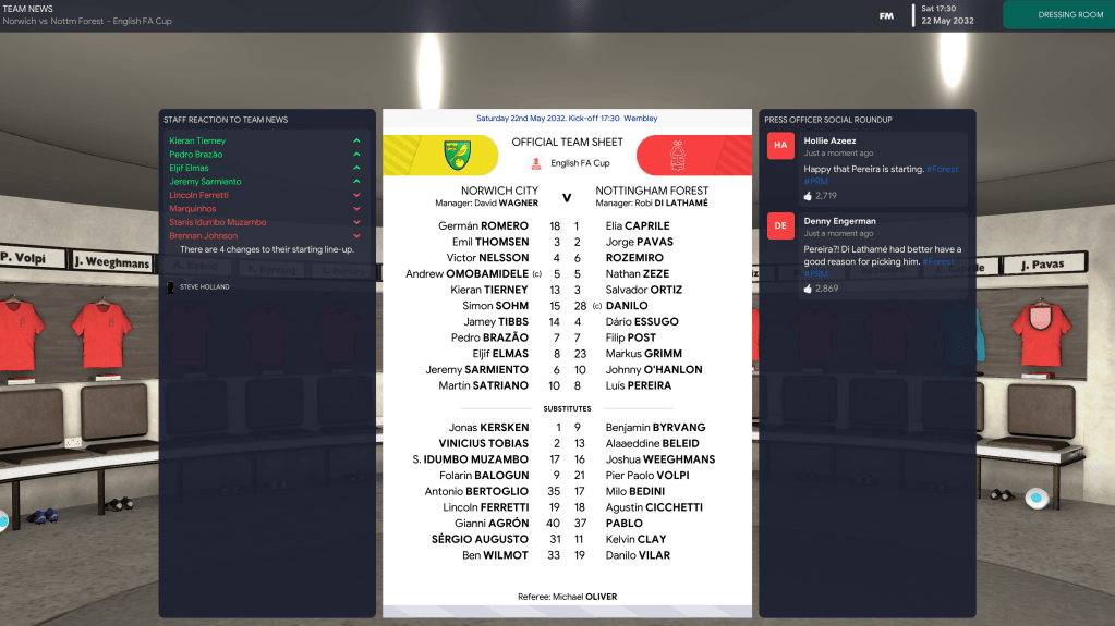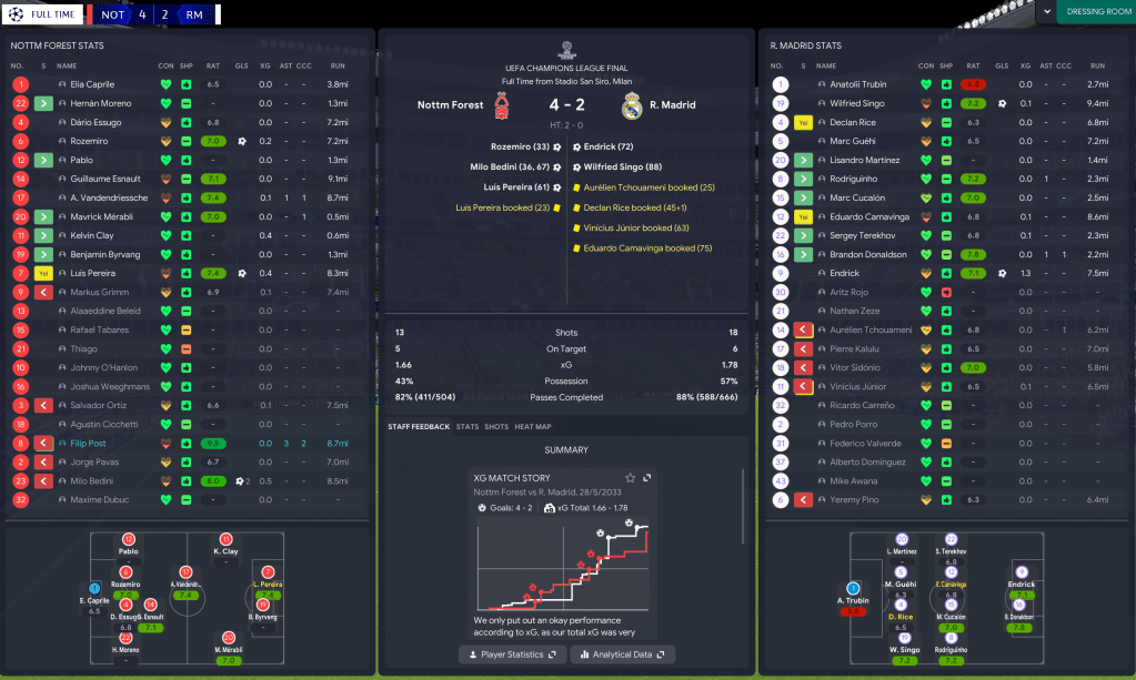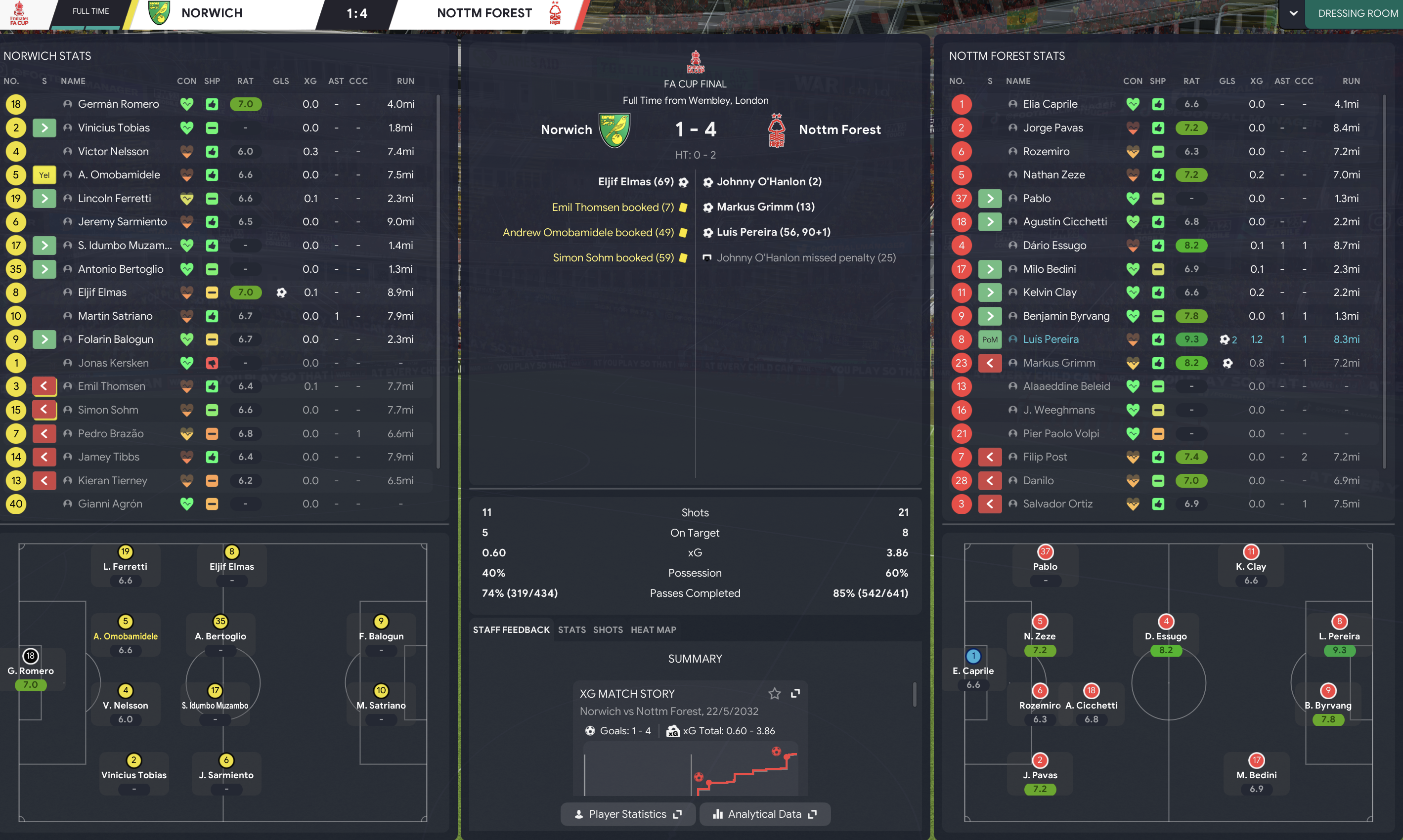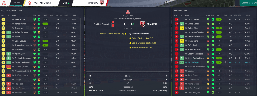 Alongside the league run, we breezed through to the FA Cup Final with a chance to defend our title against Man UFC in my 600th match as Forest manager. We started brightly as Post hit the post after 3 minutes but nothing else happened until UFC nicked an undeserved win in extra-time.