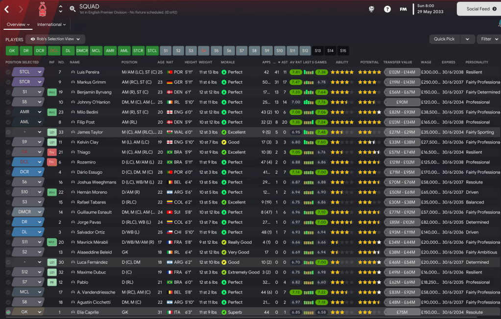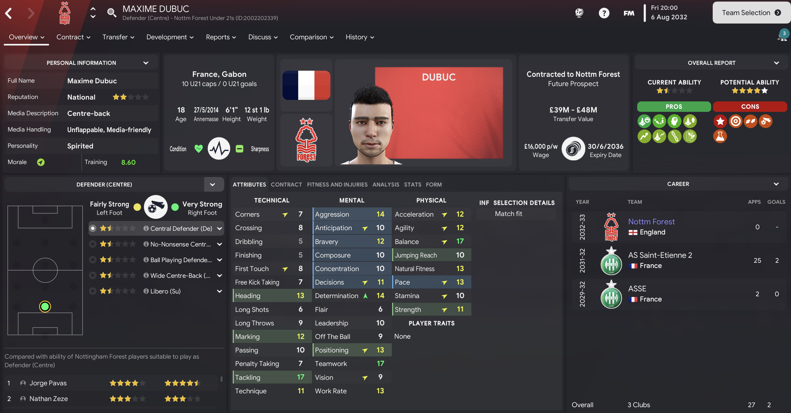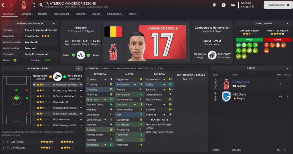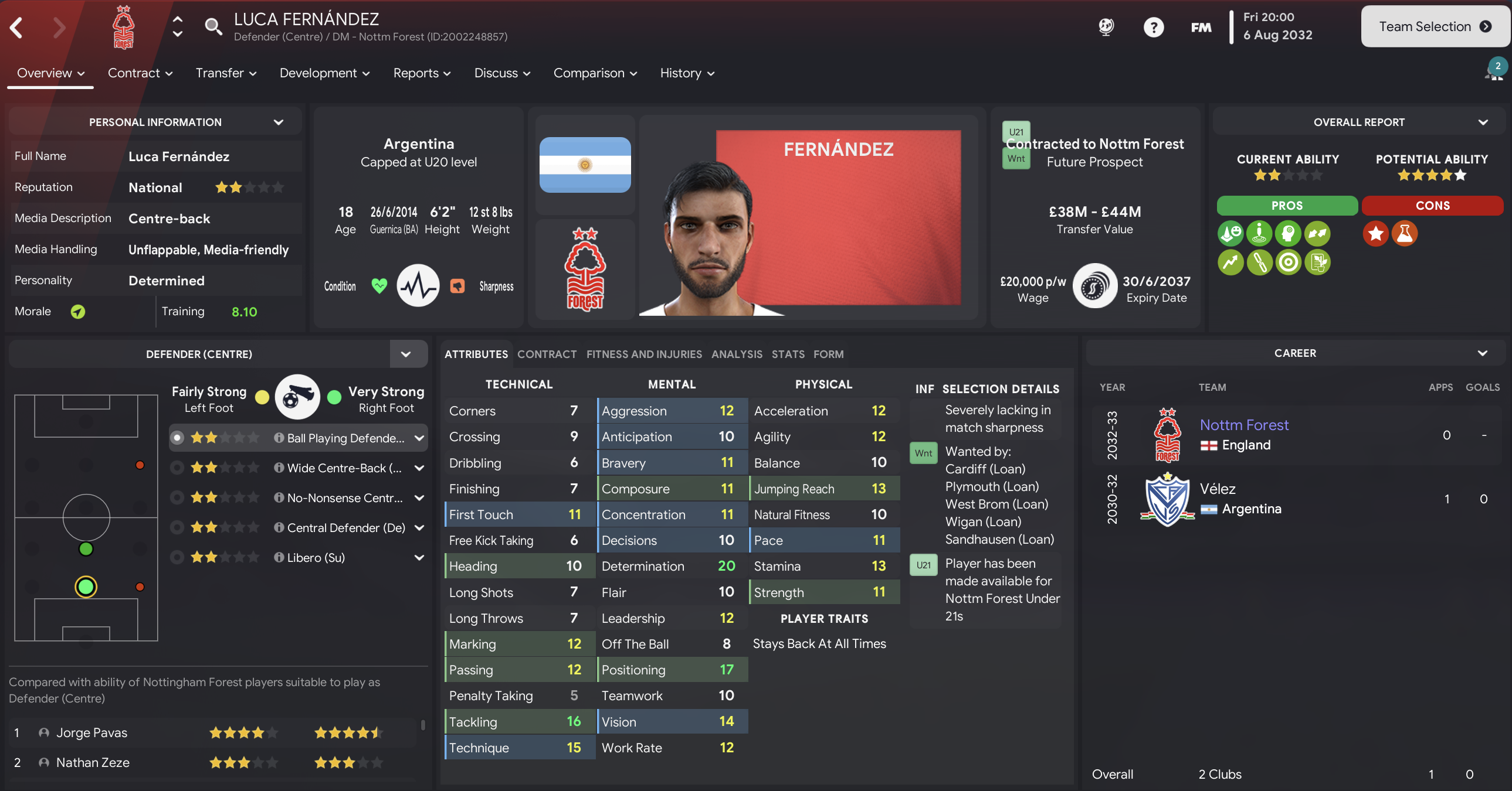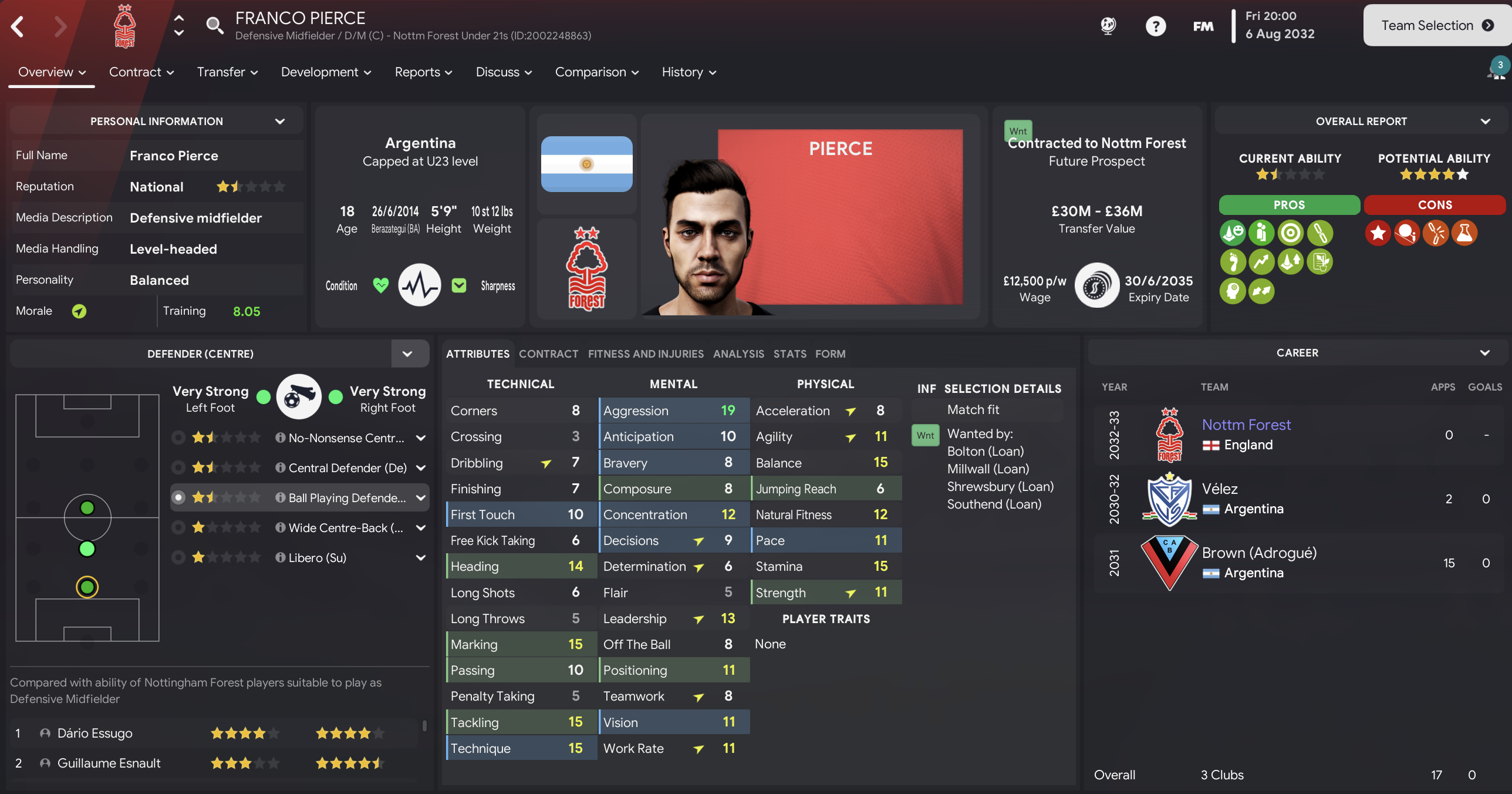 I celebrated 10 years at Forest in the summer of 2032, and decided to move on the only original player still at the club. Captain Danilo made 338 league appearances for us but wanted a ridiculous £250k a week to extend his contract aged 31. So we released him then replaced him with a potential superstar in Aymeric Vandendriessche for £36m from Genk. We also added defensive prospects in Maxime Dubuc for £23.5m from Saint Etienne and Vélez duo Luca Fernández and Franco Pierce for a combined £11.5m.