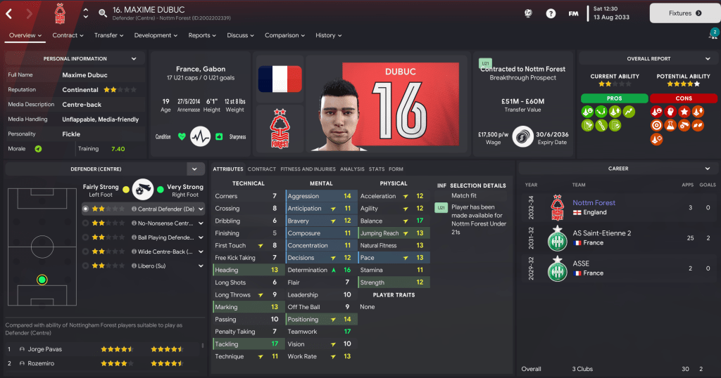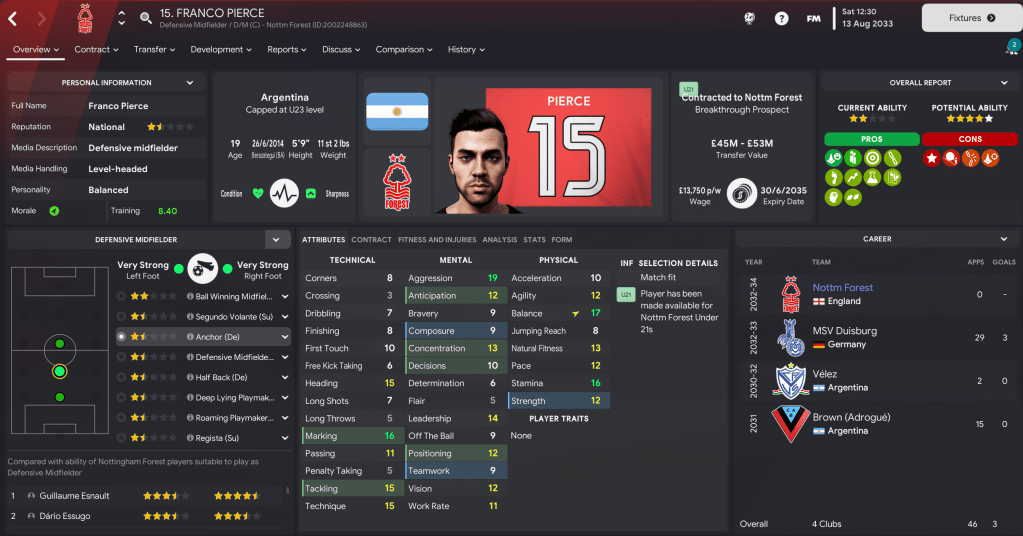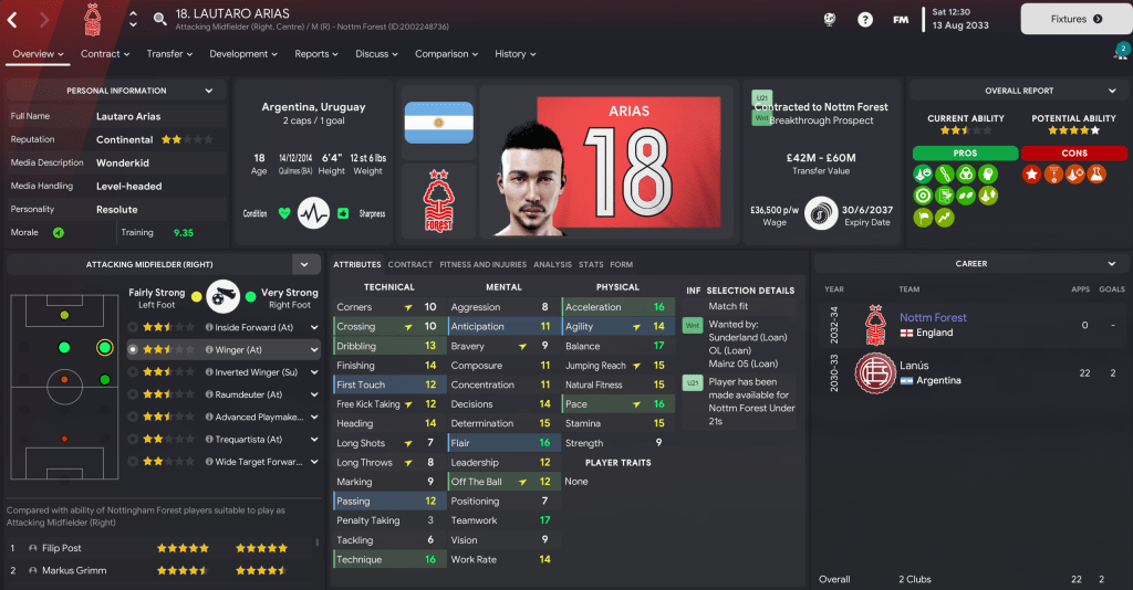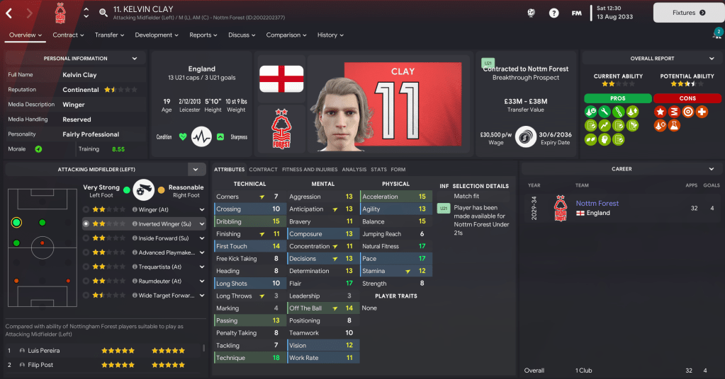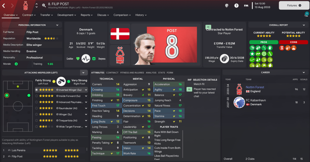 Wingers: Arguably the best player at the club is 21-year-old Filip Post on the left with Milo Bedini, who has 13 goals in 21 caps for England at the age of 20, on the right. We have two more homegrown products supporting them in Kelvin Clay and 2032 intake star Mavrick Mérabli plus new boy Arias.