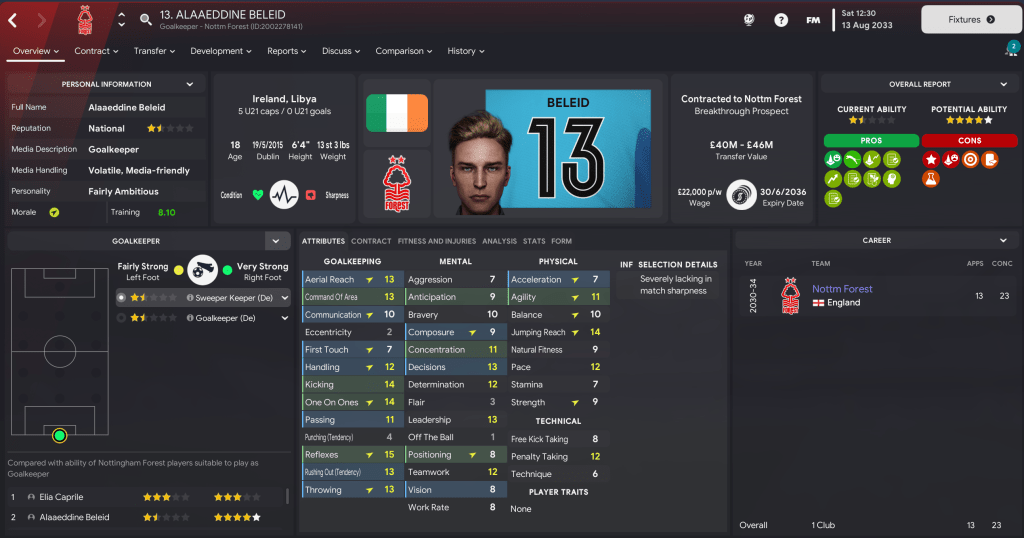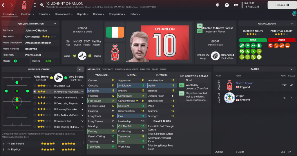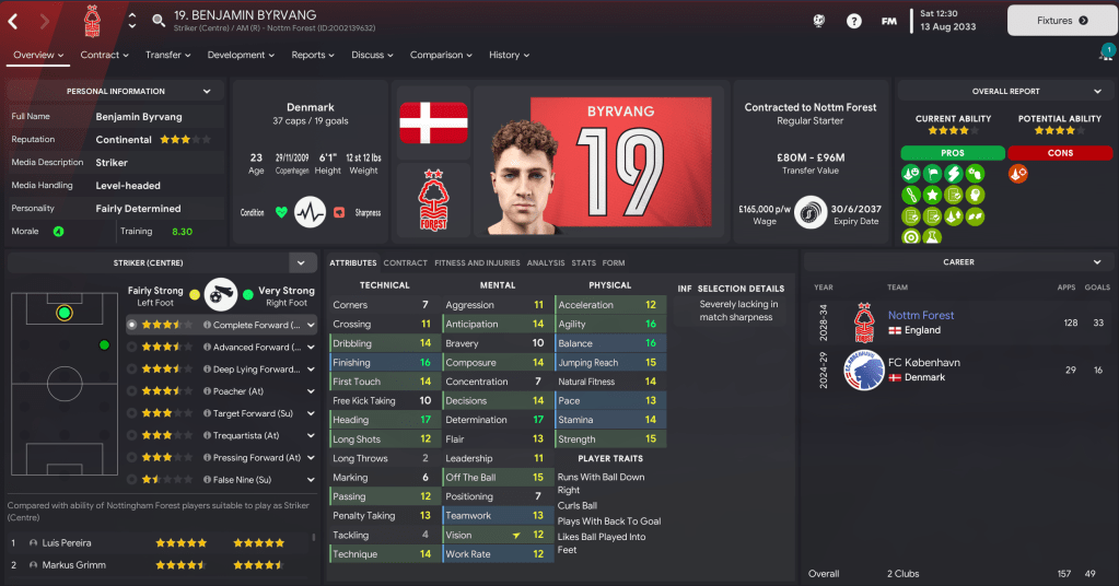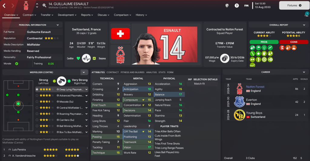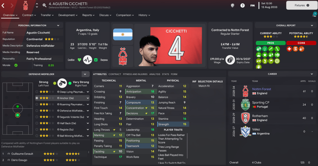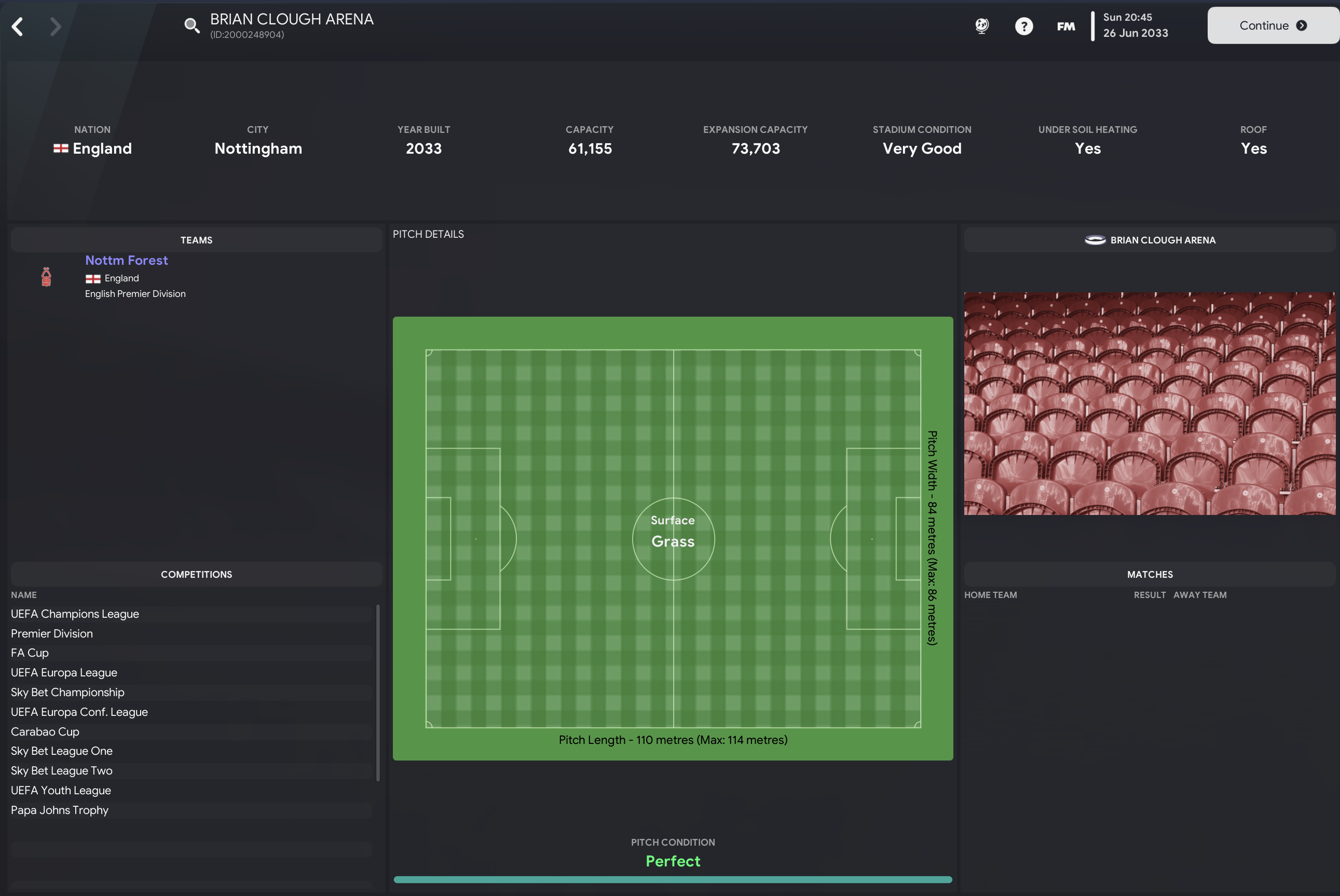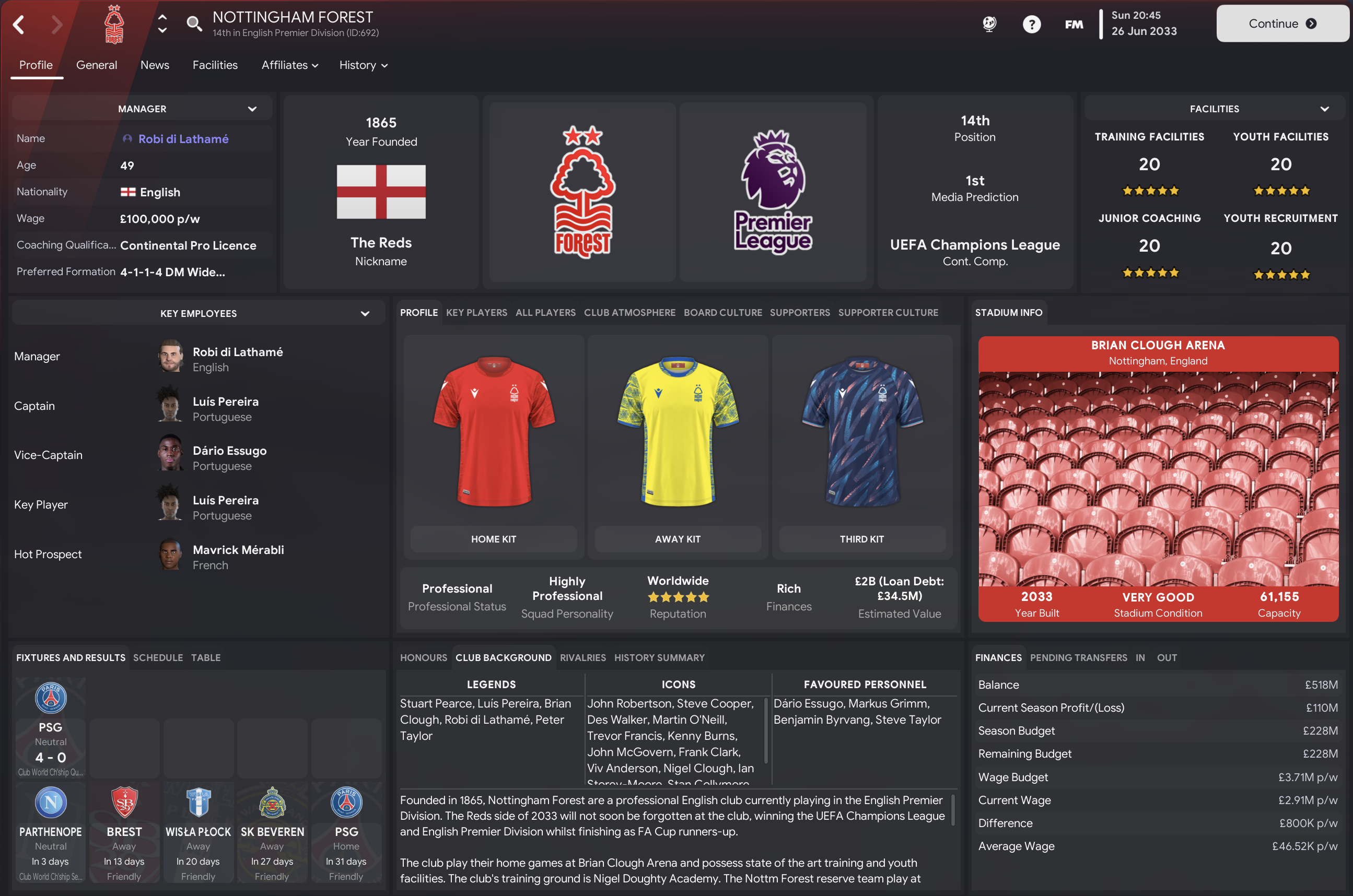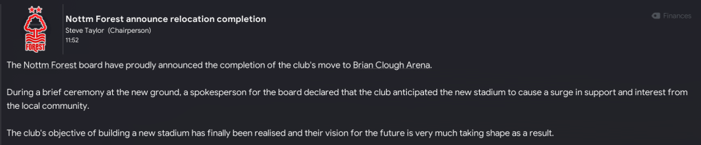 There were more exciting times at Forest in the summer of 2033 as the board’s long-planned vision of a new stadium came to reality. The 61,155-capacity Brian Clough Arena, which has an expansion capacity of 73,703, was officially completed on 26 June 2033 and puts us in a really strong position alongside perfect facilities and a bank balance over £500m for the first time.