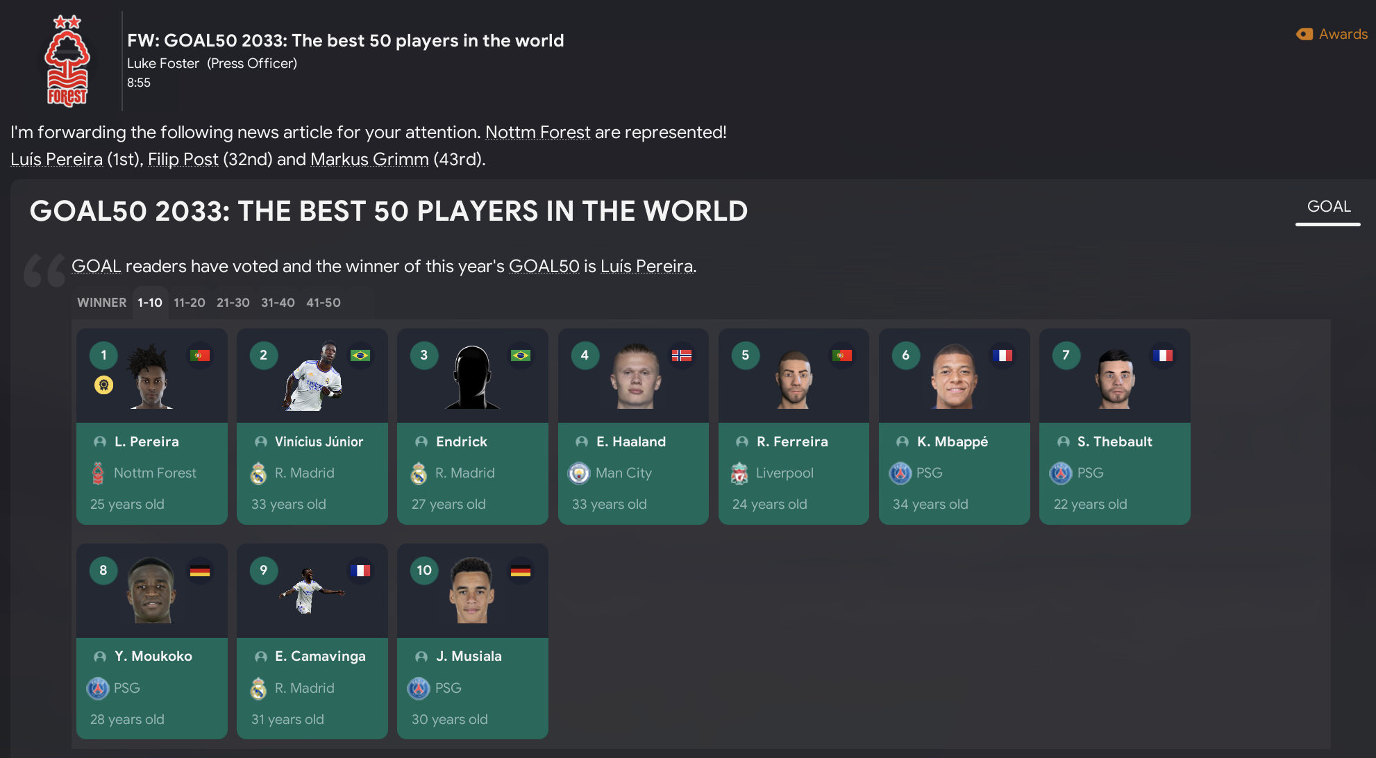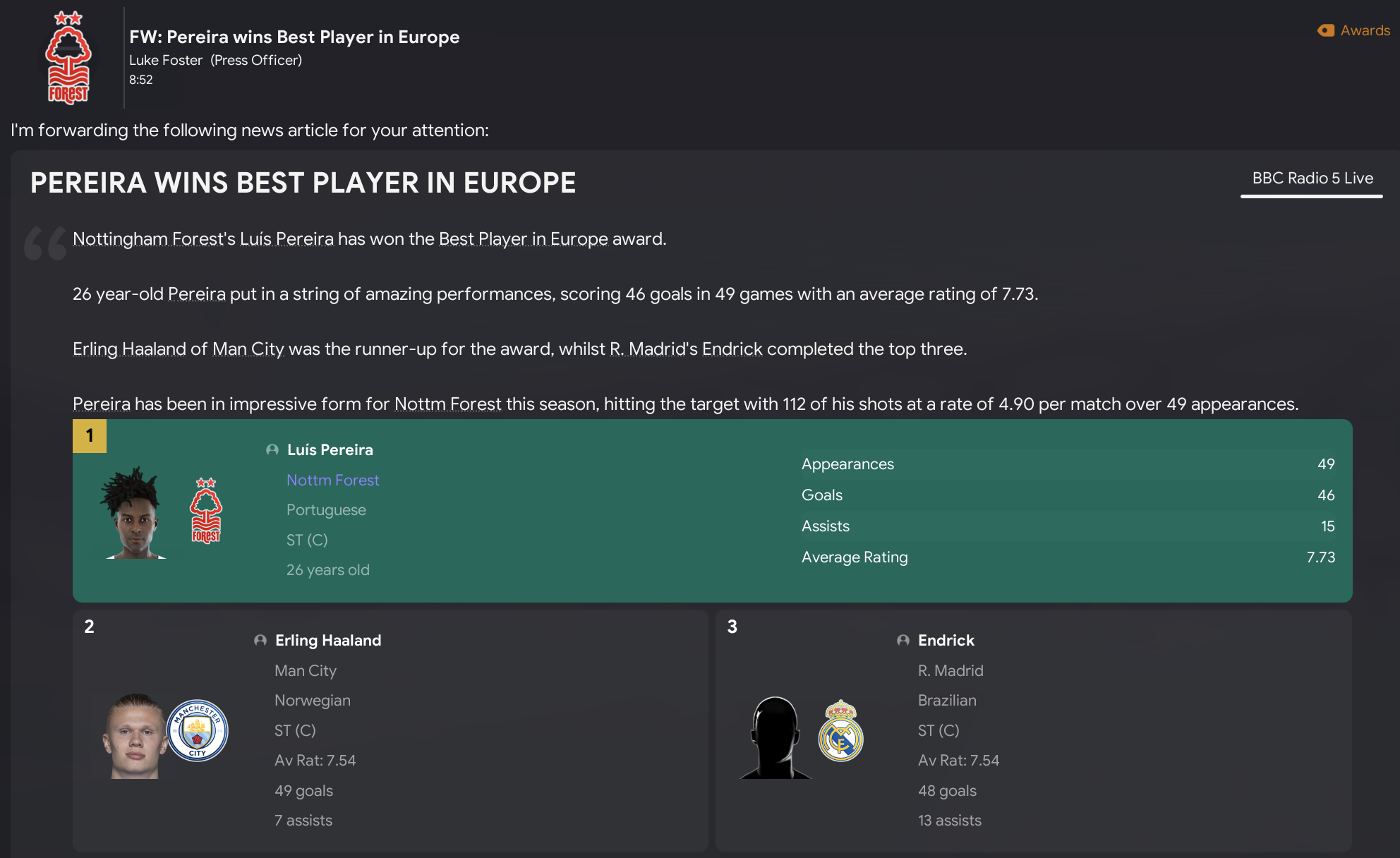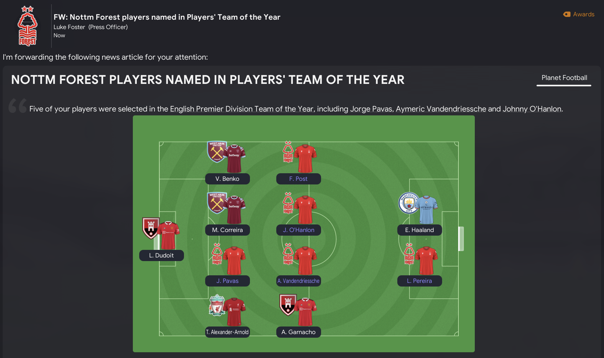 The quality in this Forest squad was proven by Pereira becoming the club’s first winner of the Ballon d’Or and Goal50. He also defended his Best Player in Europe, English Footballer of the Year and Players’ Player of the Year awards. Post defended his Players’ Young Player of the Year award, which Forest players have won the last seven seasons, while Pavas, Post, Vandendriessche, O’Hanlon and Pereira made the Premier League Team of the Year. While our U21 squad won the U21 International Cup, which was won by Liverpool, Real and Barca in the previous three seasons, led by the exciting Arias.