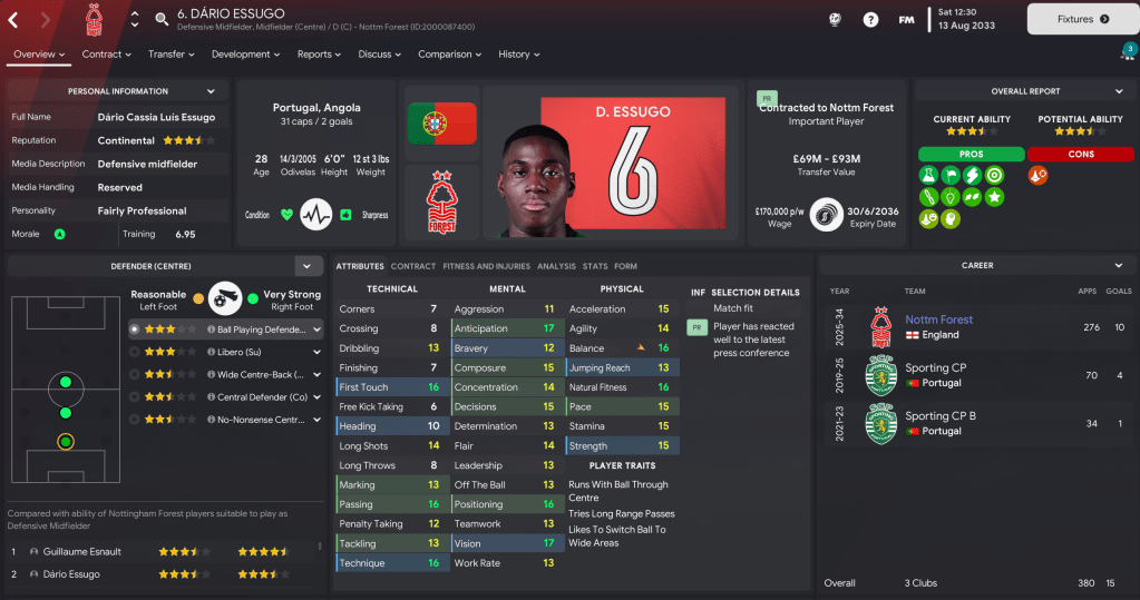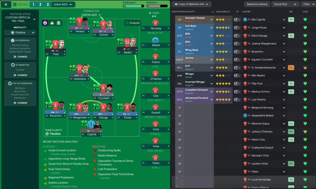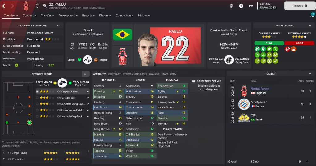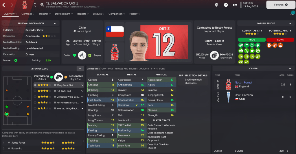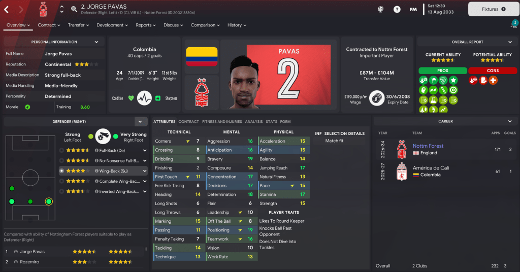 Full-backs: Colombian Jorge Pavas has established himself at right-back, with support from 21-year-old Pablo. At left-back, I’ve decided to play Rozemiro, who’s played predominantly at centre-back in his first two seasons, with backup from Salvador Ortiz, who’s made 225 league appearances since 2025.