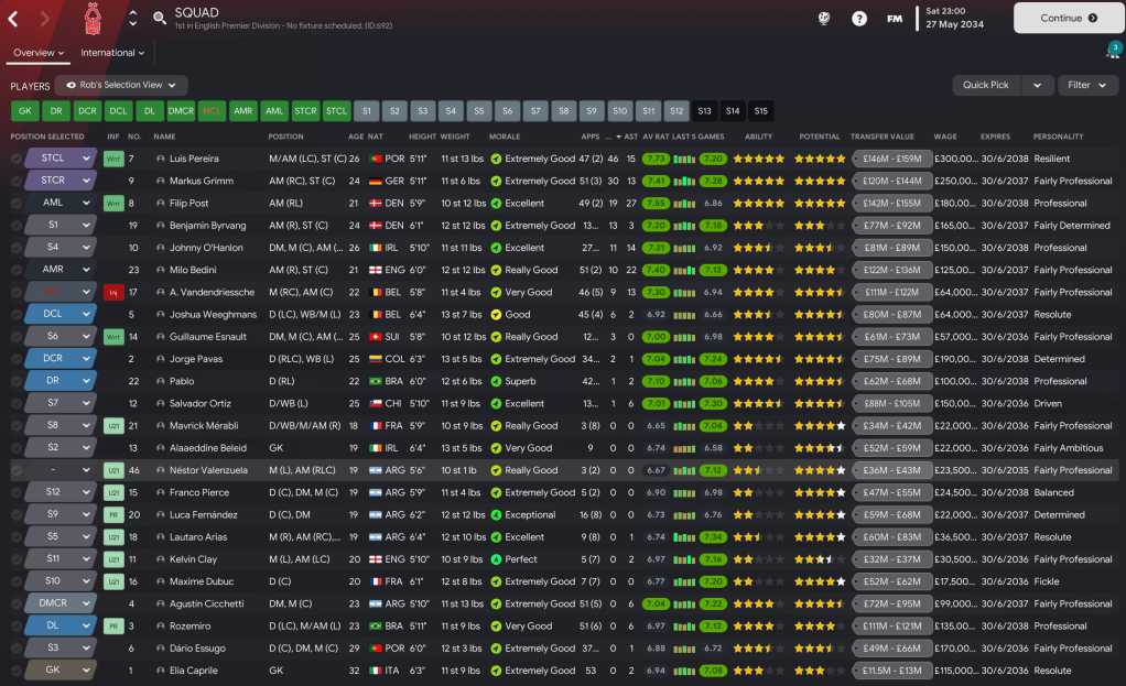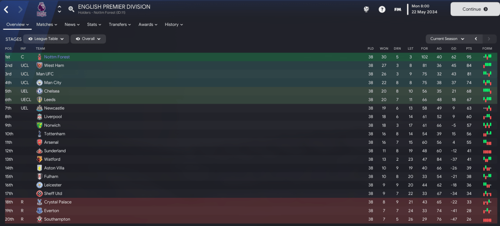 We eventually won the league by 11 points from Jürgen Klopp’s West Ham, who finished 3 points ahead of Man UFC and well clear of City, Chelsea and Leeds. We racked up a new club-record 95 points, which is second only to Liverpool’s 99 in the second season, scored 102 goals, which is a record-high in this save, and conceded 40.