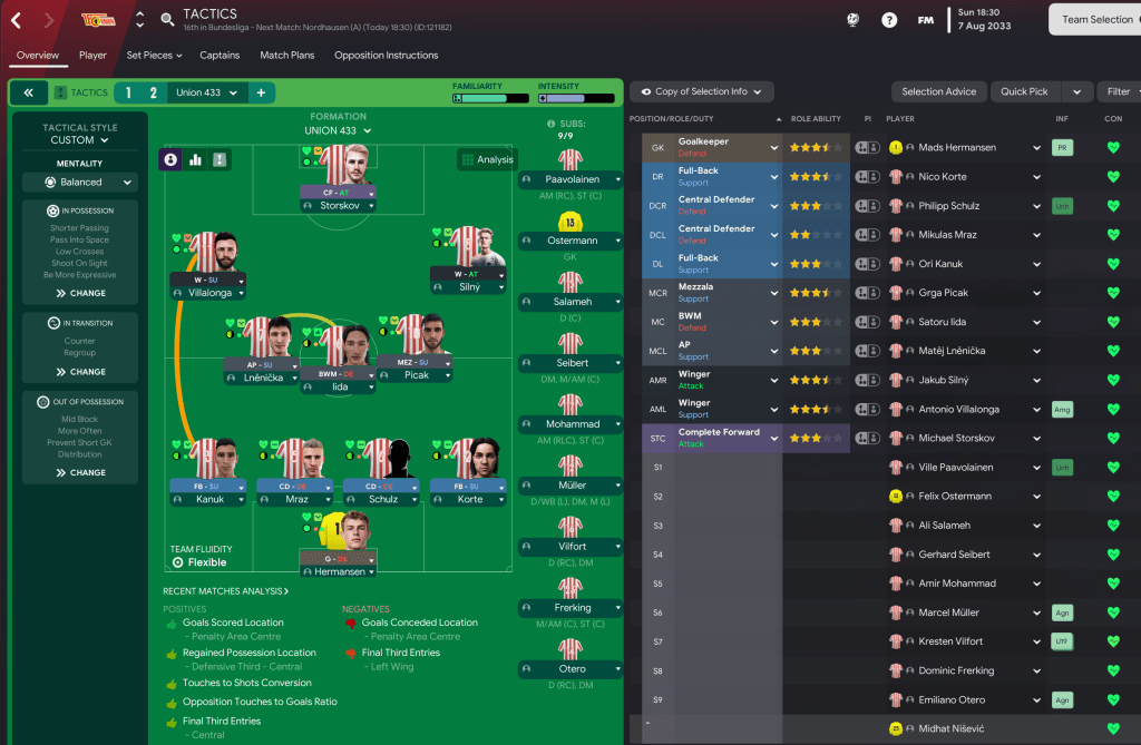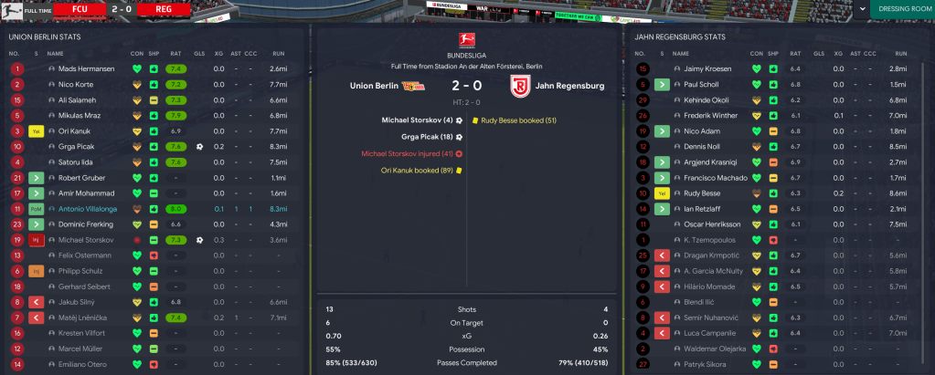 Bizarrely, Union faced five away games on the bounce. That began with a 2-0 loss at early pacesetters Gladbach, in which Storskov got injured for the third successive game. Matej Lnenicka moved up front and earned a point at Nürnberg. Then the big one took Union to Hertha, where they lost 8-0 last season. This time they applied themselves better but got dominated and lost 2-1. They also got battered at 2nd-place Wolfsburg but a stout defensive effort after Picak’s early strike earned a 1-1. But a slight tactical tweak, dropping Satoru Iida to a holding role, worked well as Picak and Mraz goals earned a 2-0 win at Köln.
