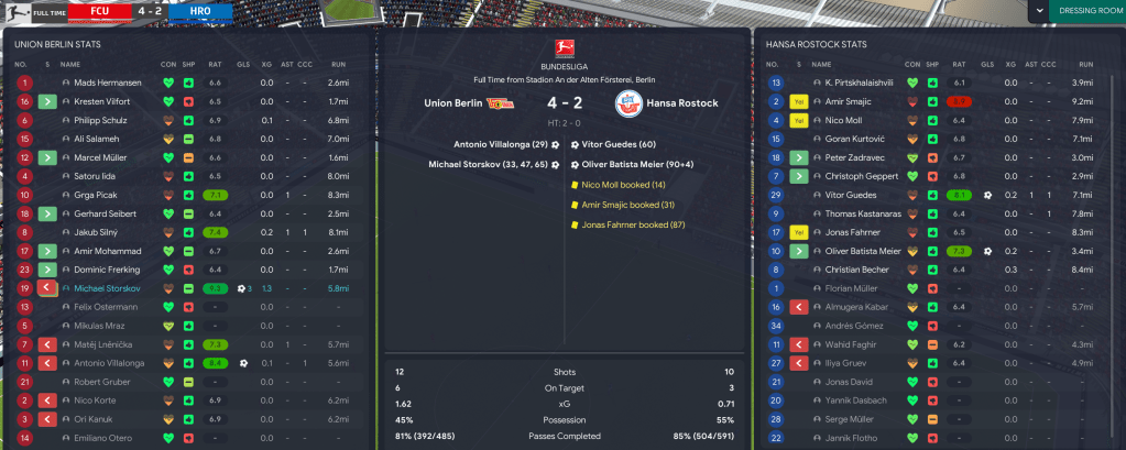 Another must-win game saw a first top-tier clash with fellow OstDeutscher side and newly-promoted Hansa Rostock. They started on the front foot with Storskov missing a sitter. But they soon took advantage of a strong start as Villalonga slammed home then Storskov tapped home from close range. That gave the striker confidence and he scored a delicious 25-yard curler 90 seconds after the break. Two Mads Hermansen howlers gifted Rostock goals back but Storskov wrapped up a hat-trick to sandwich those goals. Then got injured again!