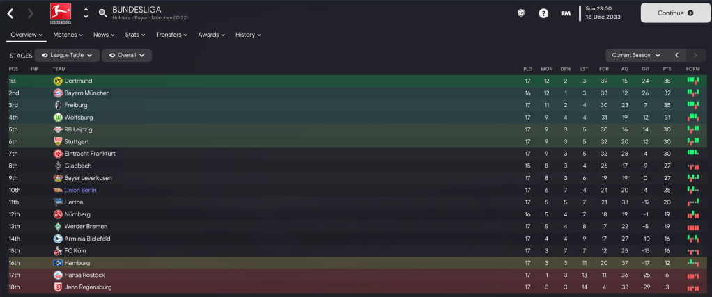 A strong run of form saw Union sitting firmly in mid-table in 10th place. Their 25 points, thanks to six wins, seven draws and just four defeats, sees them 13 points of any relegation issues and five points off the European places. Interestingly, Bayern didn’t hit the top of Bundesliga until the last week of November due to a strong Gladbach start, and now only trail Dortmund having played one game fewer.