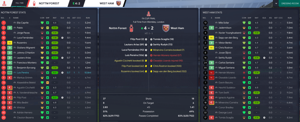 That teed up an FA Cup Final against Jürgen Klopp’s West Ham. We got a great start as Post scored inside two minutes but West Ham quickly equalised. They probably edged the second half and went in front from a direct free-kick 20 minutes from time. It looked to be drifting away from us but I made five subs, went attacking, and it worked as Byrvang crossed for Arias to nick a later equaliser. And that swung the momentum in our direction as we Fernández headed home a corner two minutes into extra time and Arias teed up a fourth for Pereira in the first minute of the second half.
