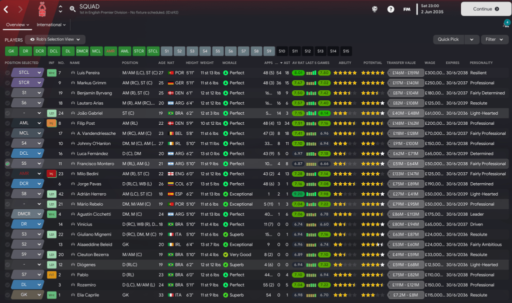 Pereira was our main man again this season, scoring a new club-record 54 goals plus 18 assists in 53 games. As the Champions League Final showed, he’s almost unplayable and is easily the best player in the world. That was confirmed as he defended his Ballon d’Or title, scoring 46 in 49 in 2034, then won the Footballer of the Year and World Player of the Year awards for the first time before winning the Best Player in Europe again.