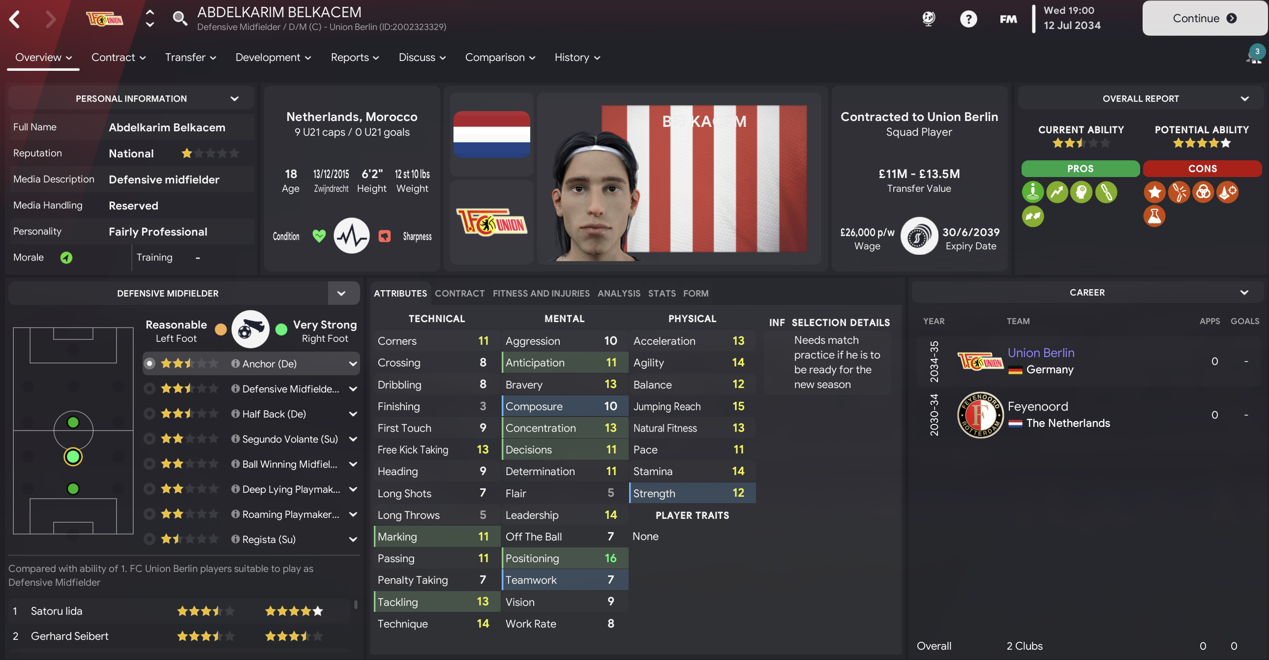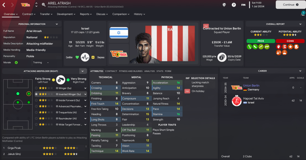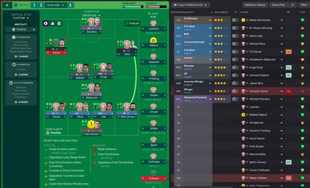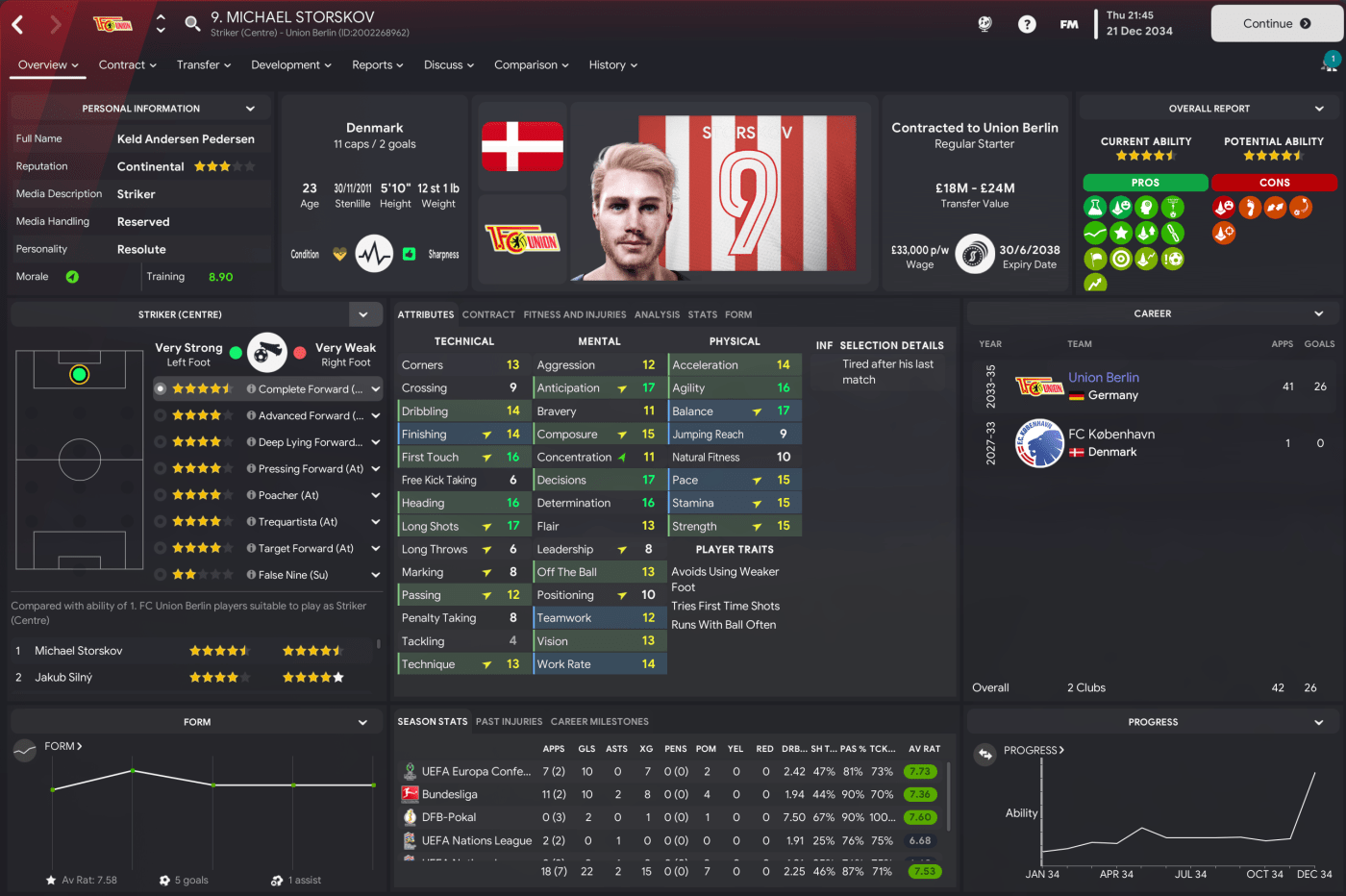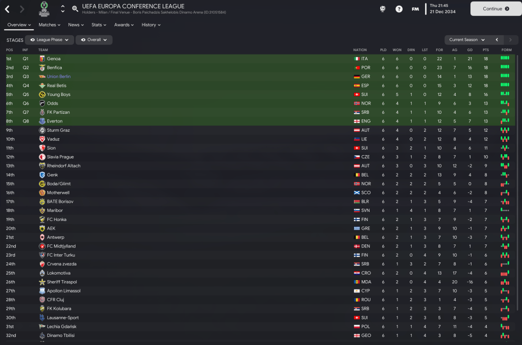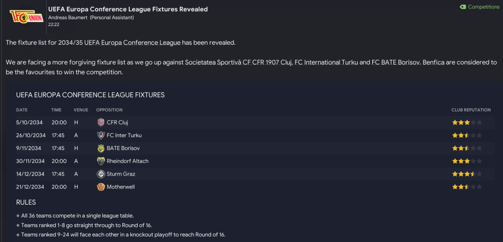Union stepped things up a notch with a 4-0 thumping of BATE Borisov. And the 100% record continued with back-to-back trips to Austria, winning 2-0 at Rheindorf Altach and 2-1 at Sturm Graz, which saw them qualify automatically with a game remaining. 2034 concluded by entertaining Motherwell and hammering them 4-0 with first-half goals by winger Jakub Silny, Picak, Storskov and centre-back Mikulas Mraz.