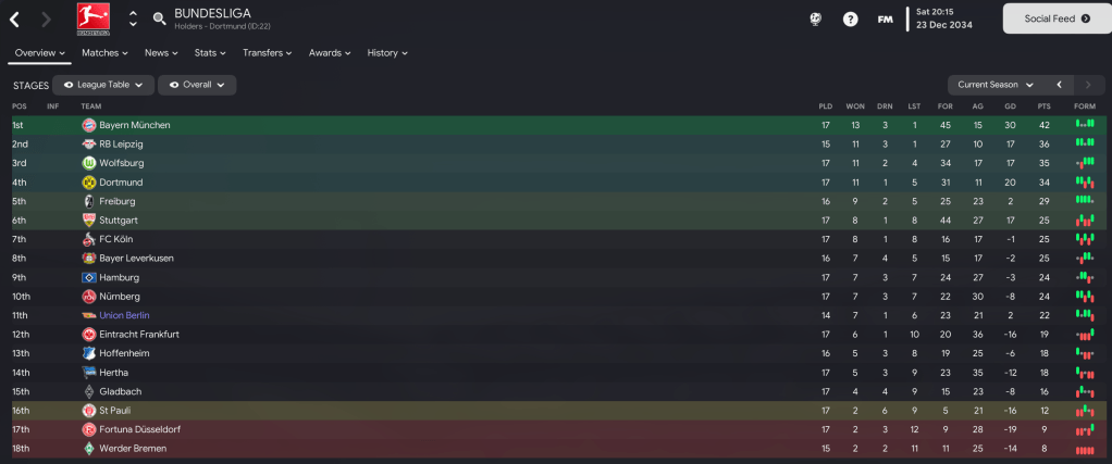 That saw an interesting trend developing as Union won all their home games and lost all their away games. That continued as a Seibert brace and Atrash’s first goal for the club led a 3-1 win over Gladbach then they got absolutely battered by 34 shots to three at Bayern but only lost 2-1, with Leandro getting his first Union goal.