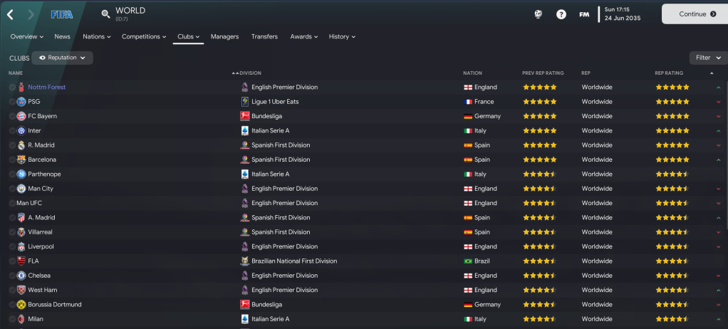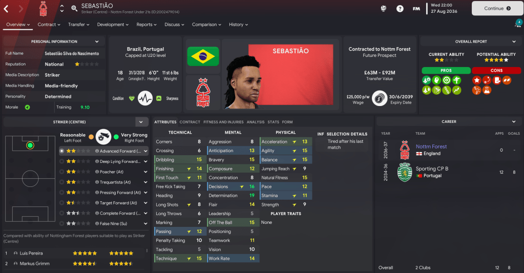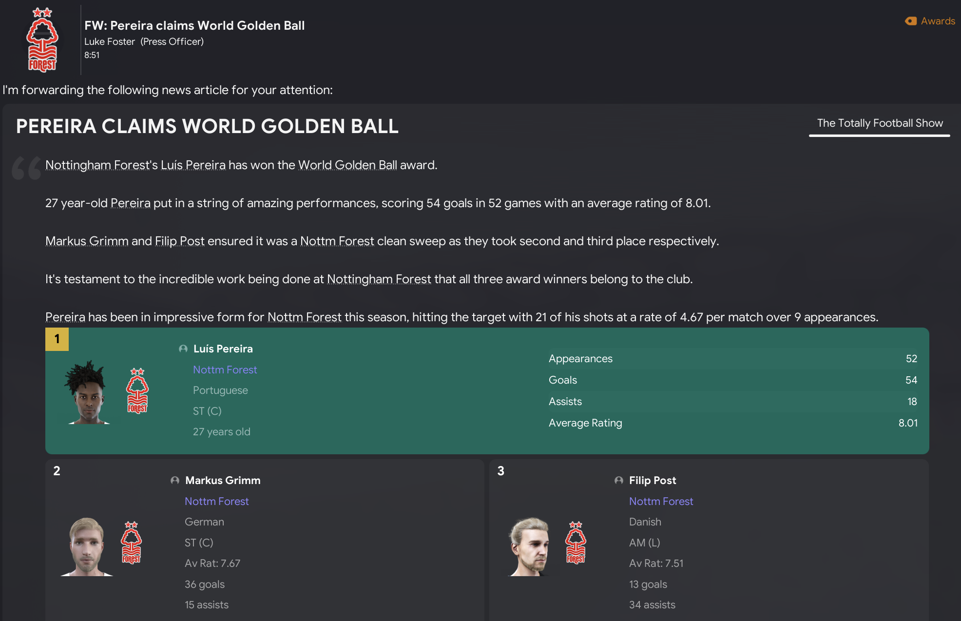 Our work over the last 13 years has seen Forest become the most reputable team in the world, but we weren’t done there. Indeed, we’d built such a strong squad packed with potential that we didn’t sign any players in the summer of 2035. That fact was further portrayed by Luís Pereira winning his third successive Ballon d’Or with his teammates Markus Grimm and Filip Post in 2nd and 3rd.