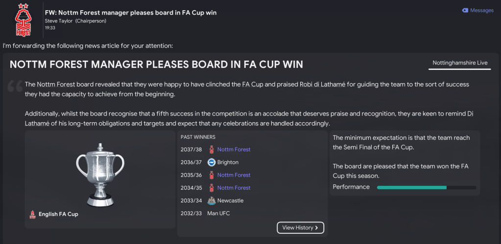 The continued success over the last three seasons takes me to 33 trophies in 16 seasons at Forest, just five short of SAF’s haul at Man UFC. So could we surpass the great man in 2038/39? Join us next Wednesday to find out!
