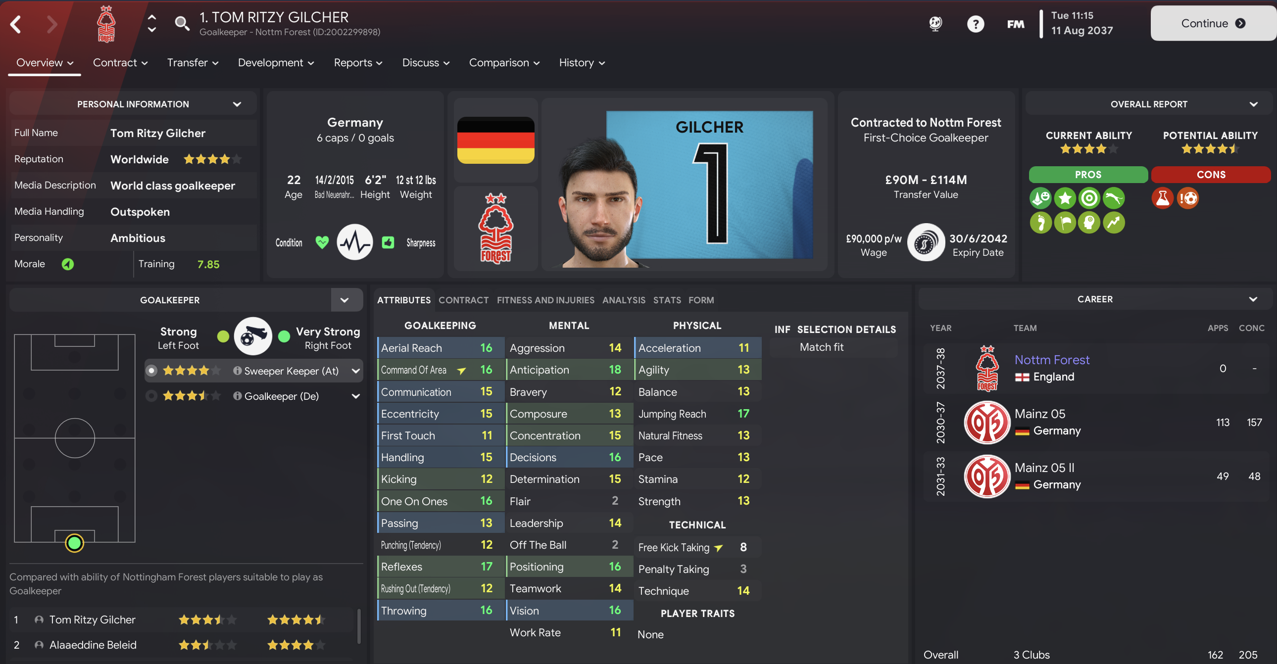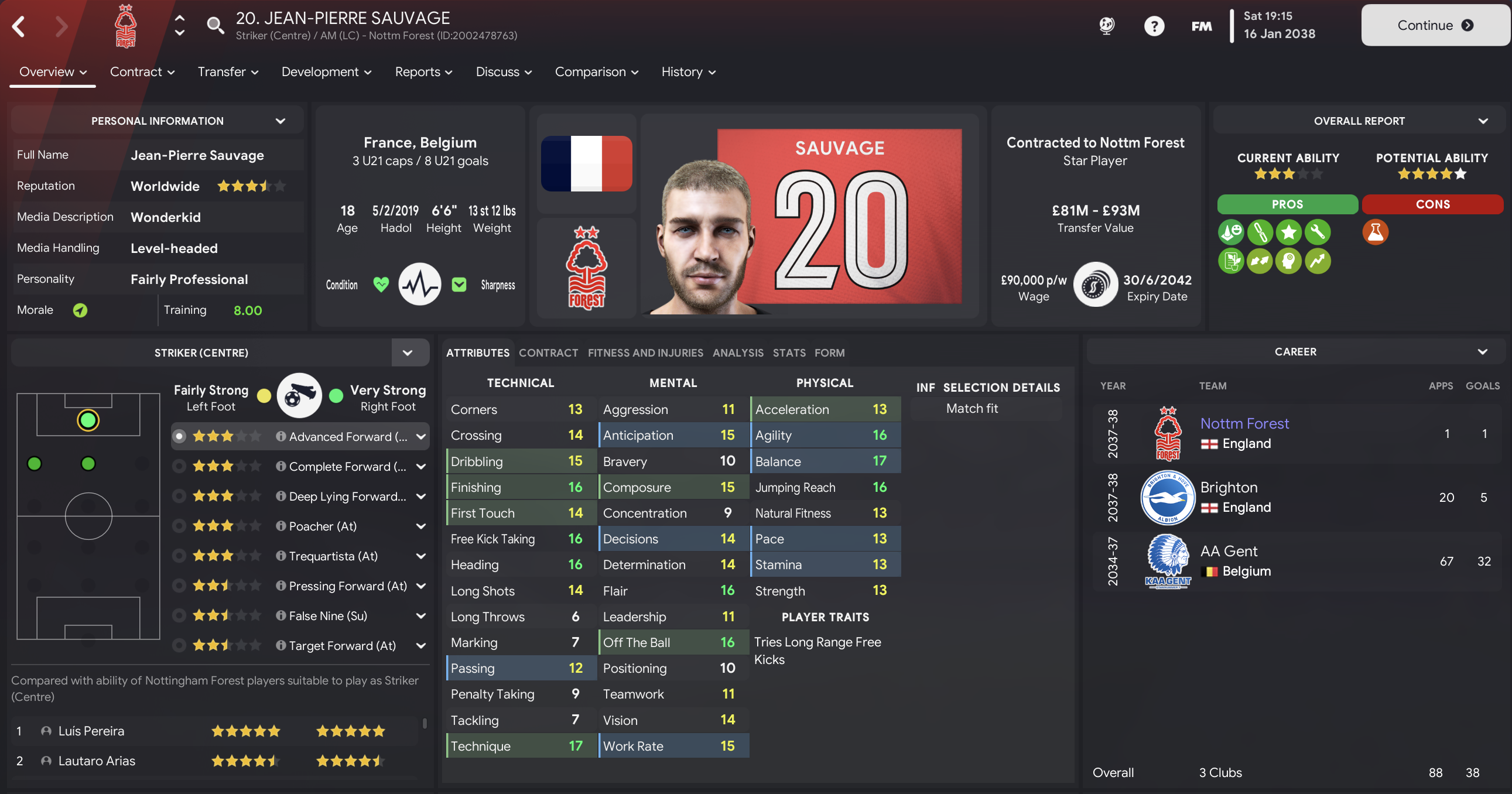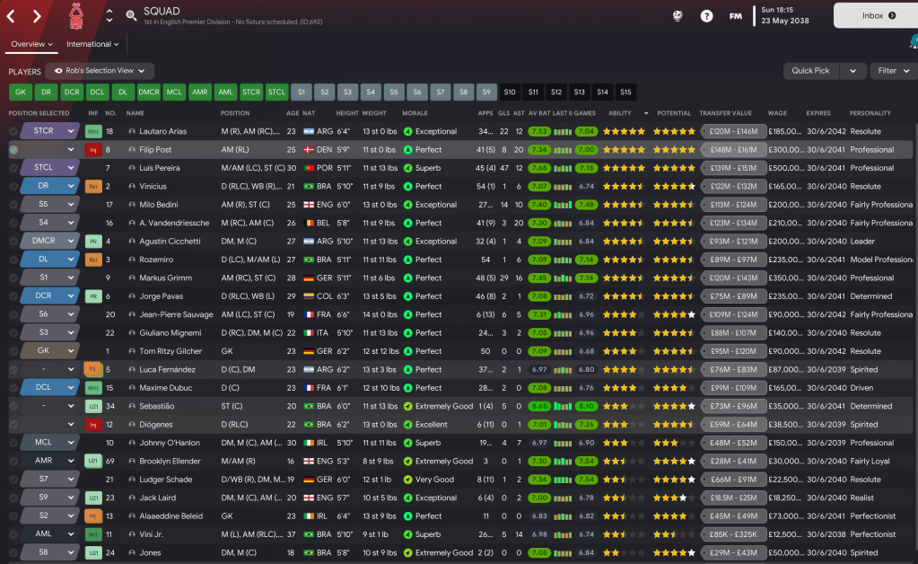 We came into 2037/38 with 30 trophies as Forest manager. I firmly pinned last season’s Final defeats on Beleid, so splurged a club-record £84m on Mainz’s Tom Ritzy Gilcher. That was countered by homegrown full-backs Mavrick Mérabli and Anton Warner going to Arsenal and Dortmund for £80m and £25m. Then in January, we signed 6ft 6in striker Jean-Pierre Sauvage for £33m from Brighton, who I’m a little disappointed discovered him in Belgium ahead of my army of scouts.