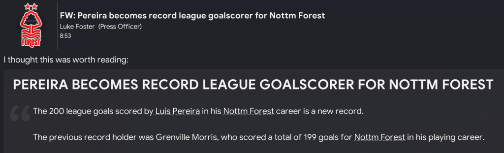That began a superb start to the campaign, winning our first nine matches. The 9th was a 4-0 win over Sunderland, in which Pereira scored his 200th league goal for the club to become Forest’s all-time record goalscorer, surpassing Grenville Morris’ 199 scored between 1898 and 1913.