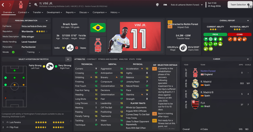 I finally gave in to the board’s demand for high-reputation players as, just like my Crazy Gang save, I snapped up Viní Jr. at the end of his Madrid contract. He was joined by another exciting attacker in Sporting’s Sebastião for £20m and homegrown Alaaeddine Beleid steps up as starting goalkeeper.