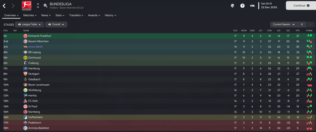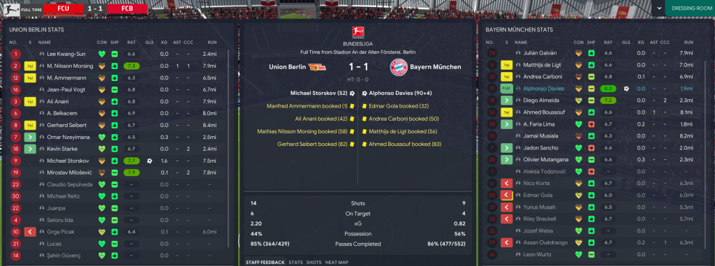 Next up was a really tough game as Union welcomed 2nd-place Bayern, against whom they have an abysmal record. In 25 meetings in this save, Union have won one, lost the other 24, conceded 63 and scored just 16. And Prusseit had lost all six of his meetings with the champions. Prusseit prepared by resting his first 11 for a midweek DFB-Pokal game, which they lost 3-2 to Leverkusen, while Bayern played their strongest team – yet magically still had a fully fit team. But Union had the better of a fairly even game and got their reward as Storskov tucked home just after the break. And they appeared to be edging towards a huge win until, out of nowhere, Alphonso Davies scored a 30-yard screamer for an undeserved 94th-minute equaliser. Because of course he did. But on the positive side, that was Prusseit’s first point against Bayern.
