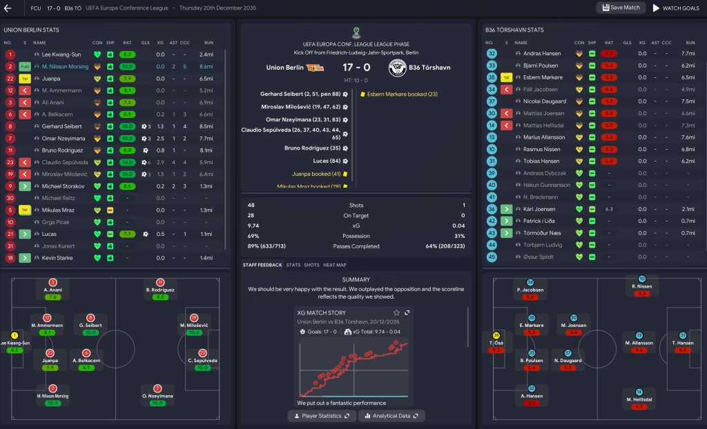 The league phase concluded by hosting fittingly named Faroese side B36 Tórshavn, who were 36th out of 36. Prusseit sent the lads out with an attacking approach and boy did that work. Union raced into a 10-0 half-time lead and settled for seven more after the break with Seibert, Milosevic and Nzeyimana hat-tricks and a Sepúlveda double hat-trick, including four in a seven-minute period, as they won 17 (Seventeen)-0!