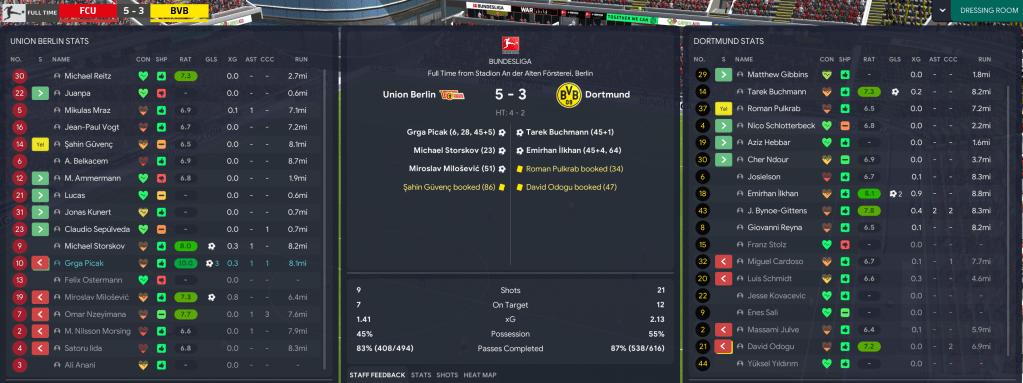 Union had been clinical so far but took that to new levels at home to Dortmund. Picak got the show started with a goal after six minutes then his brilliant run and cross laid on the second for Storskov before scoring his second inside half an hour. A crazy few minutes of injury time saw Dortmund score twice before Picak went down the other end to make it 4-2 in the 50th minute! Milosevic settled any nerves six minutes after the break before Dortmund got another back. Union even had three goals disallowed by VAR but settled for a thumping 5-3 victory, which was their first over the “big two” of Bayern and Dortmund.