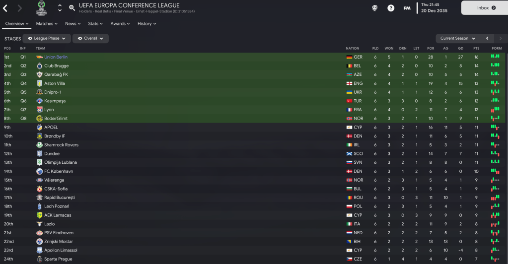 The toughest game saw Lyon come to town and another rotated side dominated with Sepúlveda scoring again before Picak and Storskov came off the bench to wrap up a comfortable 3-0 win. A trip to Norway followed and Union failed to win a league phase game for the first time at the 10th attempt as they drew 0-0 with Bødo-Glimt. Two weeks later, they returned to Scandinavia and brushed København aside 3-0 with goals by Sepúlveda, Seibert and Lucas.