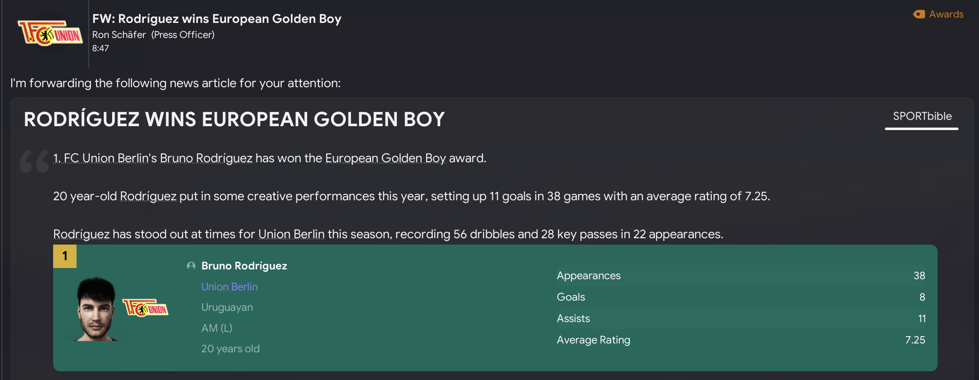 Prusseit’s claims about having the best young squad in Europe were given some clout as impressive centre-back Mraz won FIFA Best U21 Men’s Player, with holding midfielder Iida in third, then the exciting Rodríguez became the first-ever Union player to win European Golden Boy.