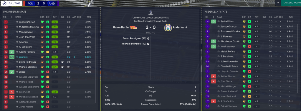 Feyenoord at home was up next and Union did well to hold them to a 0-0 before their toughest game yet, as they lost 3-0 at Arsenal. A more winnable away game took them to Czech Republic and Rodríguez created two goals in two minutes for Storskov and Leandro before a late Picak strike sealed a 3-0 win.
