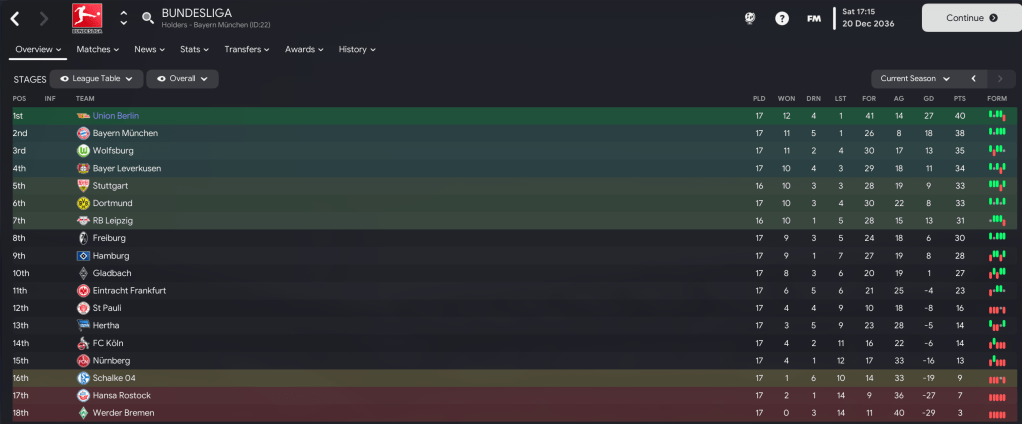 Union came into the final few games of 2036 as surprise leaders and still undefeated in Bundesliga. Quickfire goals from two of their South American contingent, centre-back Cláudio Borborema and Sepúlveda, earned a 2-1 win at struggling Köln and extended their lead at the top to seven points as Bayern drew with Freiburg. But now the fixtures got tricky.