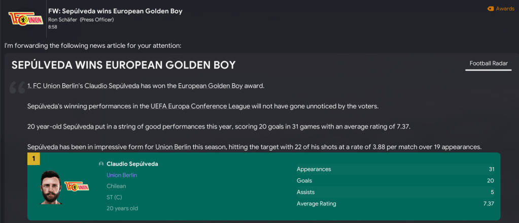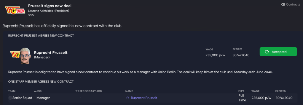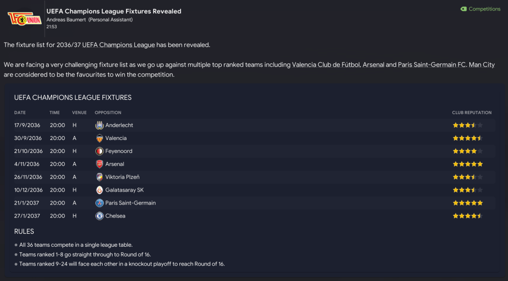 Union Berlin enjoyed the best season in club history in 2035/36 as they finished in a record high of 2nd in Bundesliga and won their first major trophy as Ruprecht Prusseit led them to the Europa Conference League. Now they had to step up to the challenges of competing in the Champions League for the first time.