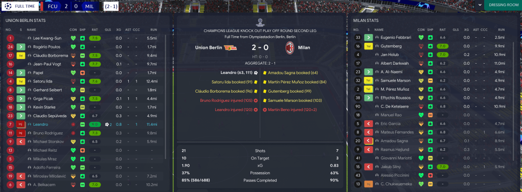 In the playoff round, they drew AC Milan, who’d signed former Union winger Jakub Silny after 18 months at Barcelona. Union edged the first leg in Italy but couldn’t finish their chances and were punished by a goal by old man Charles De Ketelaere. They were much the better team back in Germany but were wasteful yet again in a poor first half. Prusseit increased the intensity and they got level as Leandro collected the ball out wide, cut inside and smashed it past the keeper. But it finished 1-0 to go to extra time. Prusseit pushed his team up the pitch and increased the pressing on an old Milan team and it eventually made their dominance count as Leandro again popped up with a tidy finish. Milan offered nothing and Union deservedly progressed 2-1 on aggregate. Bizarrely, the home leg was played at Hertha’s Olympiastadion and nearly trebled Union’s record attendance and gate receipts as 62,816 people showed up. Yet the board don’t see the need for a new stadium?