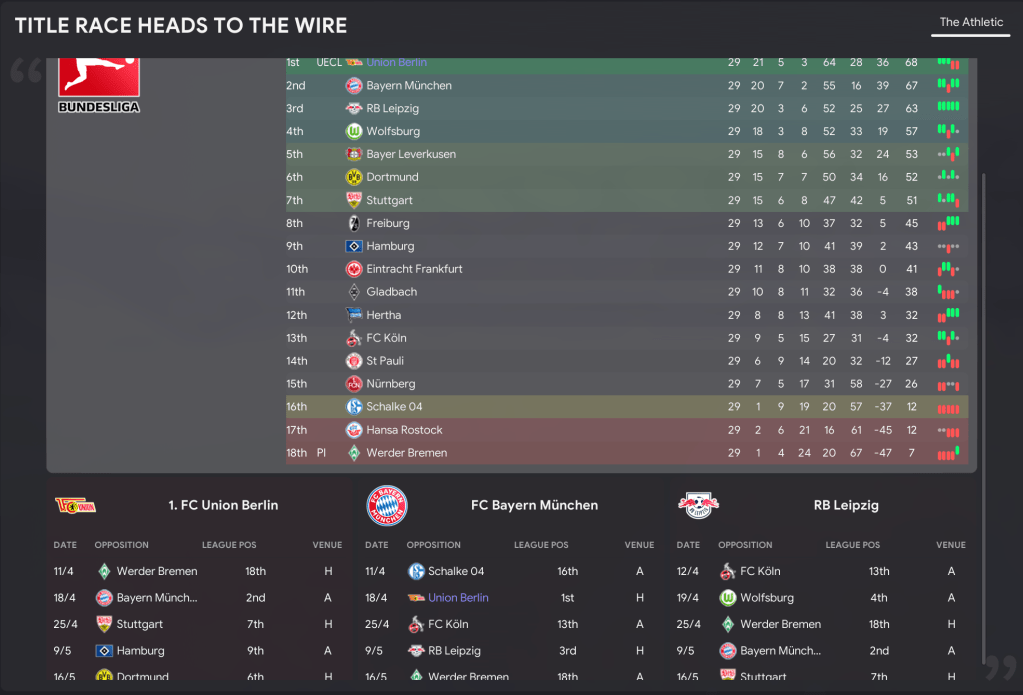 Heading into the final eight games of the season, Union found themselves top of Bundesliga with a four-point advantage over Bayern. However, for the second season in a row, their run-in was pretty brutal with six games against teams in the top eight.