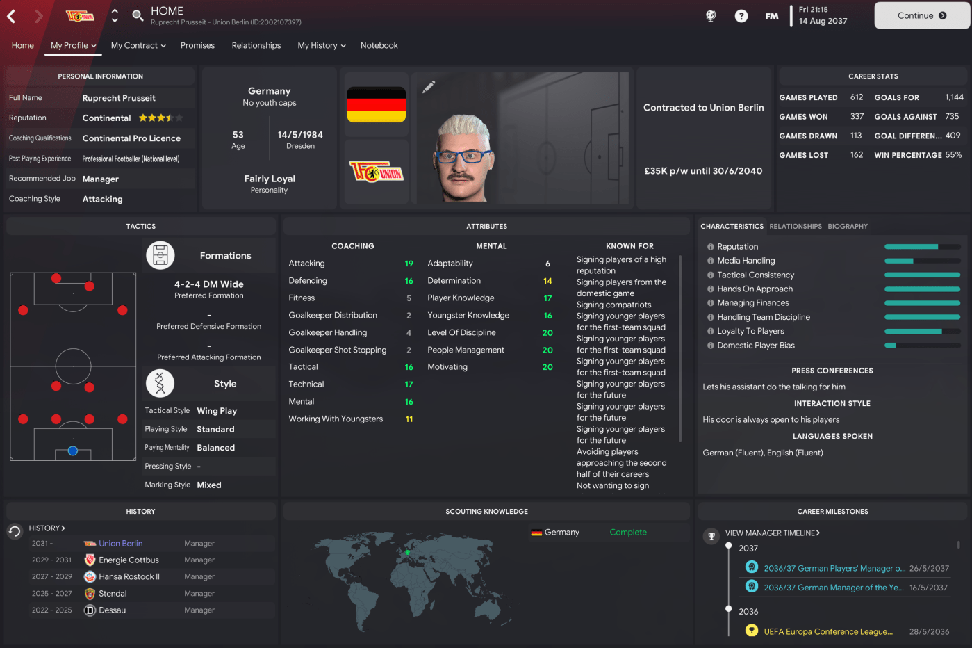 - 1. FC Union Berlin: Prusseit’s current club flirted with relegation from Bundesliga for many years before finally dropping into tier two in 2031. But their fortunes changed when they brought Prusseit in from Cottbus, winning 2. Bundesliga in 2032 then finishing 7th twice and 2nd twice in Bundesliga, plus winning the Europa Conference League in 2036.