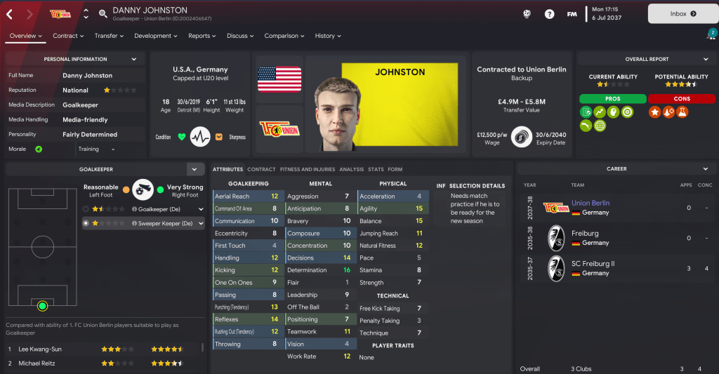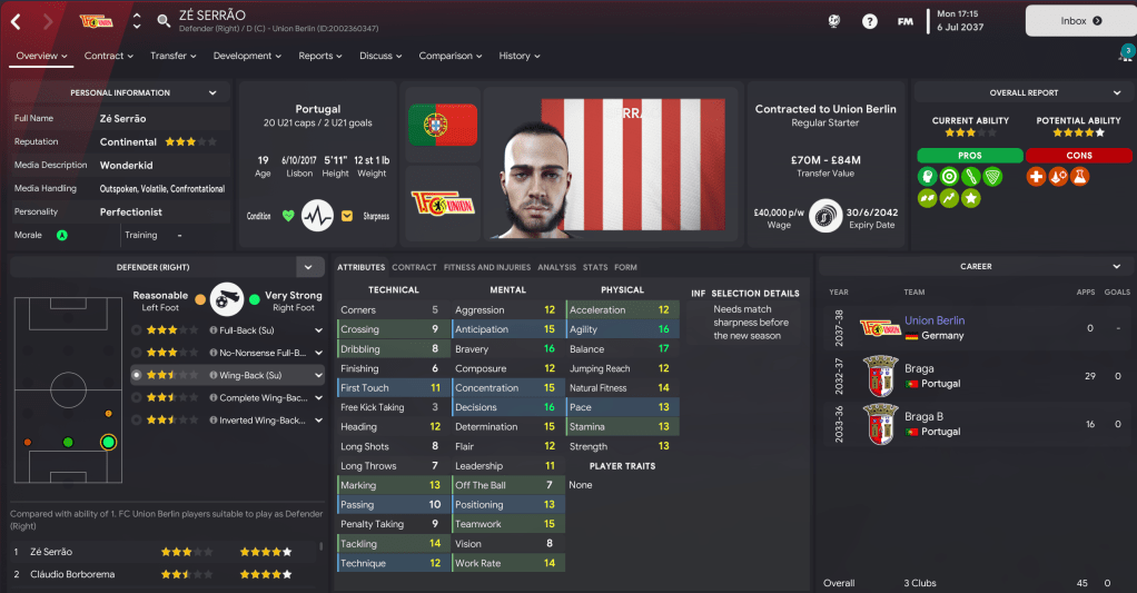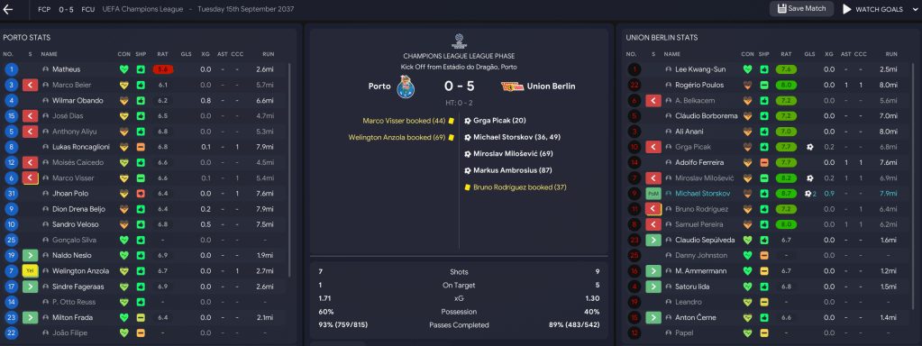 He came into the summer of 2037 with the club’s bank balance standing at £232m. That was boosted by selling underperforming players like midfielder Gerhard Seibert to Monaco for £11.25m, centre-back Mikalus Mraz to Nice for £6.75m and full-back Mathias Nilsson Morsing to Valencia for £12m. However, they also lost promising centre-back Jean-Paul Vogt to Man City for a club record £45m.