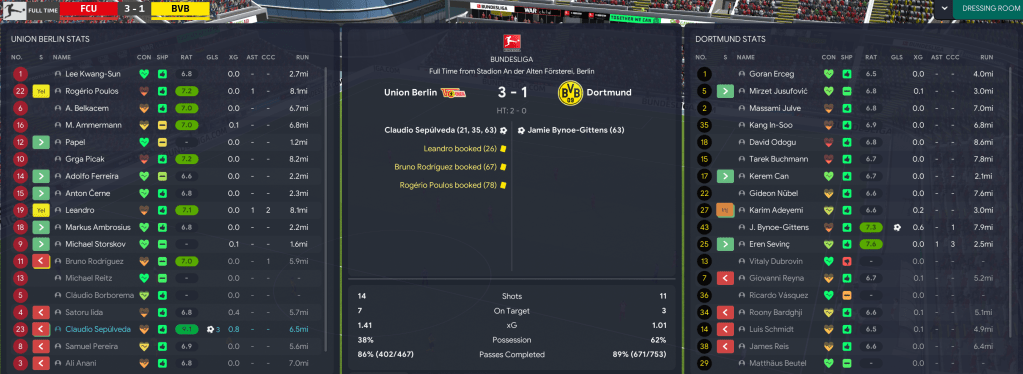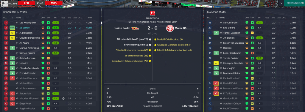 Union began at home to promoted Mainz and the new formation looked pretty good as they dominated by 17 shots to six. But it took them a while to get the goal they deserved with Miroslav Milosevic’s penalty followed by Serrao creating a tap-in for Bruno Rodríguez. That earned the new right-back player of the match on his debut but he obviously then suffered a hernia in training.