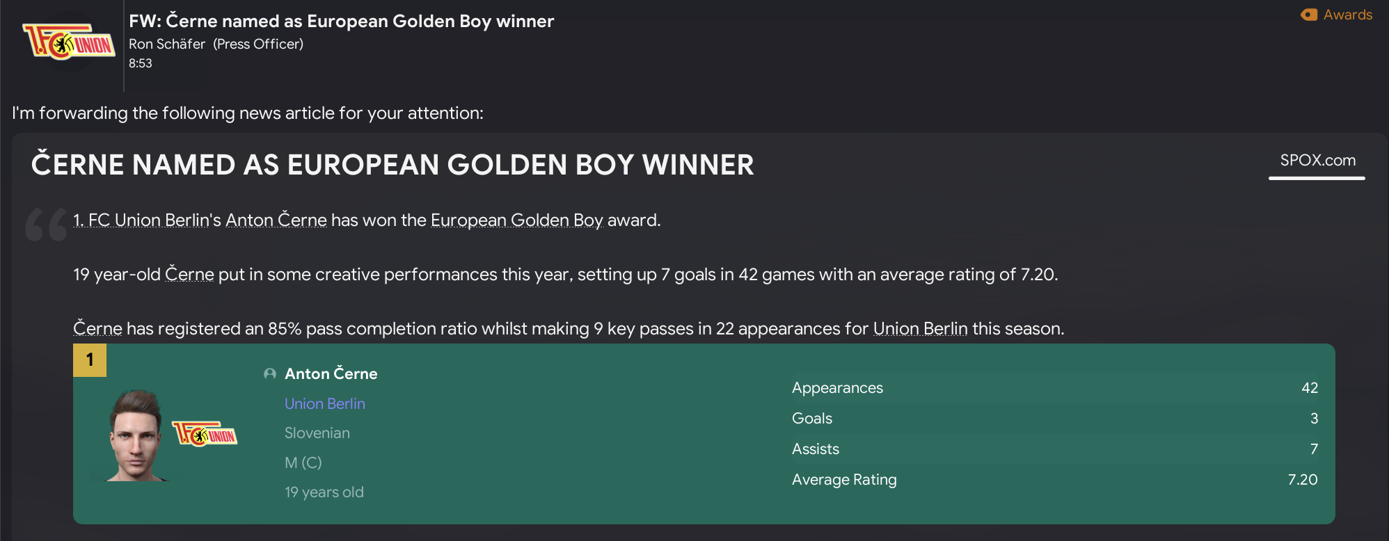 Union maintained their grip on the FIFA Best U21 Men’s Player as Milosevic won the award with a clean sweep of the top three as last year’s winner Rodríguez in 2nd and Sepúlveda in 3rd. Then a surprise decision saw backup Slovenian midfielder Anton Çerne win European Golden Boy.