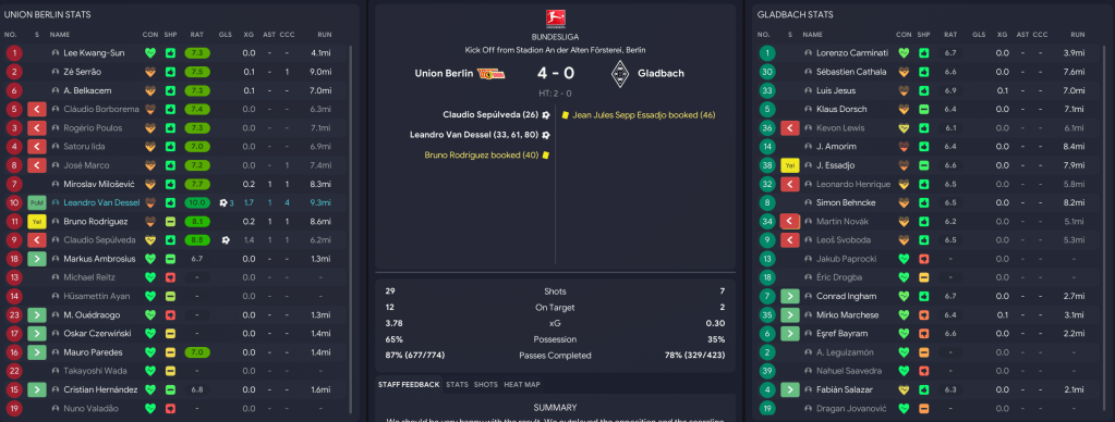 The title defence began at home to Mainz and Union sent out a statement to the German pundits. Sepúlveda tucked home after seven minutes and wrapped up a hat-trick all assisted by Van Dessel within 47 minutes, then goals by Van Dessel, midfielder José Marco and attacker Markus Ambrosius wrapped up a 6-0 thumping. Van Dessel was on form again in their first away day, scoring both goals in a 2-0 victory at Nürnberg.