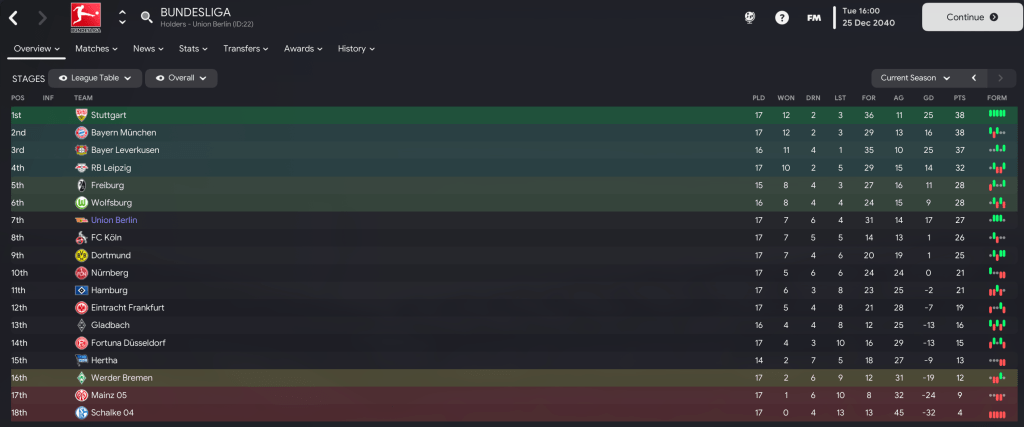 That slight pickup in form saw Union finish 2040 in 7th place in Bundesliga, trailing the European places by 1 point, Champions League places by 5 points, but surprise leaders Stuttgart by 11 points. Despite their struggles, Union had scored the third-most goals in the league with 31 and only conceded 14.