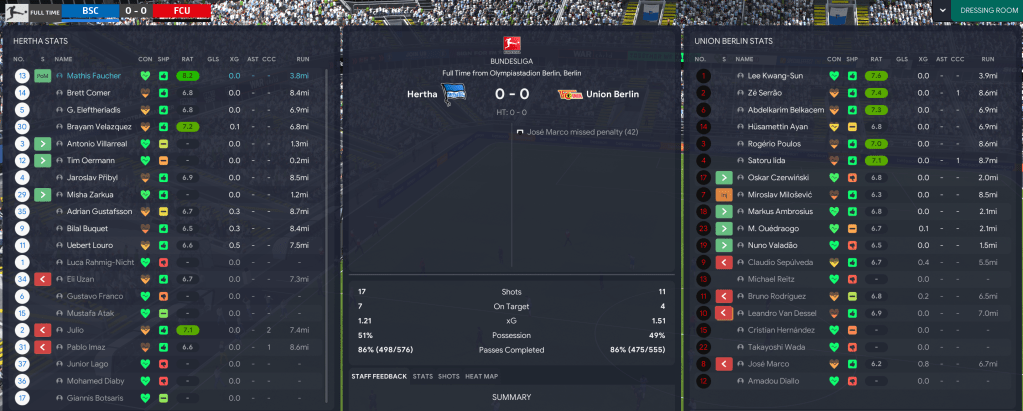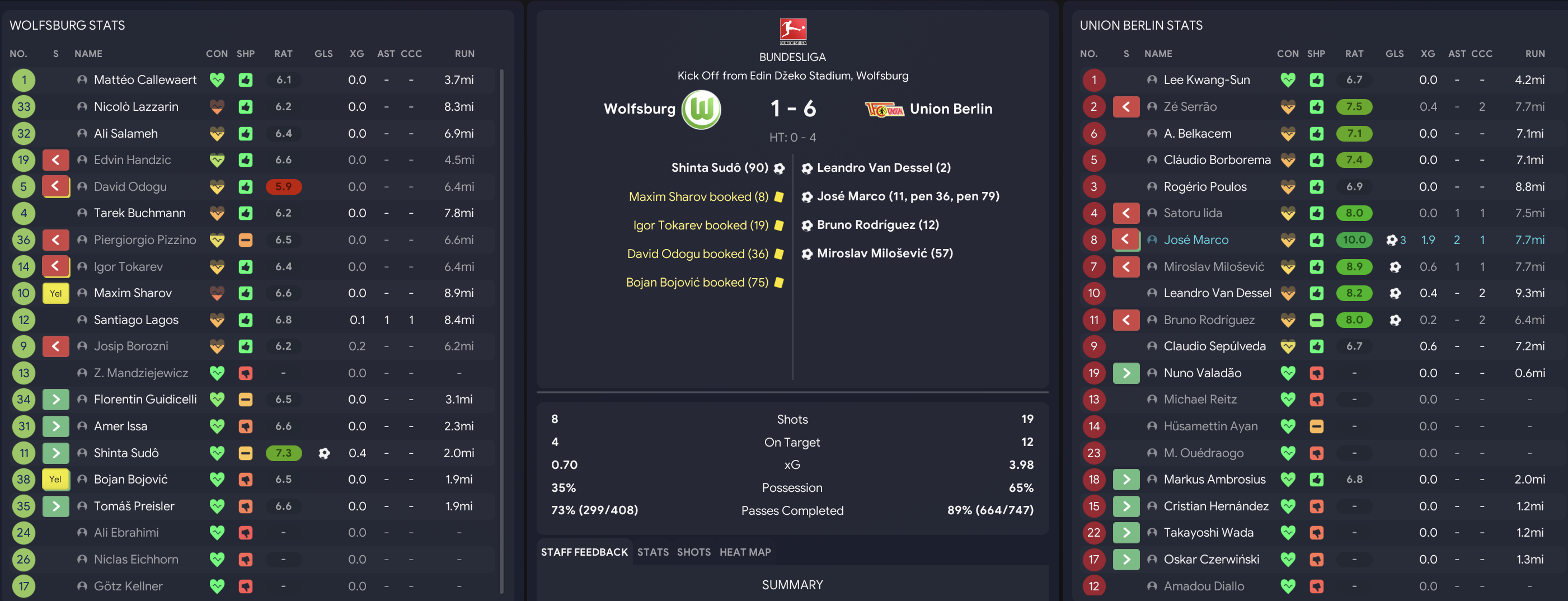 A week later, another big game followed at home to fellow OstDeutsch side RB Leipzig. Union dominated another exciting game in which the sides shared 40 shots, but it looked destined for another 0-0 until Sepúlveda struck on 83 minutes. Prusseit then celebrated his 800th match in management with the best performance of the season. The in-form José Marco was superb again, bagging a hat-trick as Union ran riot 6-1 at 5th-place Wolfsburg.