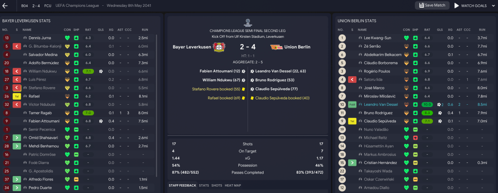 The semis saw an all-German affair as Union faced Leverkusen while Arsenal took on Barcelona. Union were at home again in the first leg and dominated the game by 24 shots to seven but only made one count as winger Miroslav Milosevic drilled home from 20 yards. But the second leg was a different story as Van Dessel scored a brace and created goals for Rodríguez and Sepúlveda to earn a 5-2 aggregate success. So Union were heading to consecutive Champions League Finals!