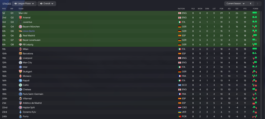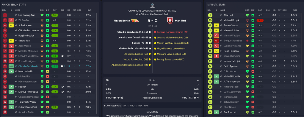 Next up was Man UFC, who won every match in the league phase, but Union seized control by taking their chances in devastating fashion. Sepúlveda scored either side of half-time, Van Dessel scored in first-half injury time and Fágner and Ambrosius both scored in second-half injury time to crown a famous 5-0 victory. That allowed Prusseit to rotate and a 2-1 loss at Old Trafford sent Union into the semis for the second time.