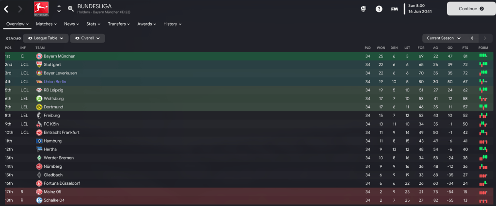 Union’s uptick in form early in 2041 had lifted Union up to 3rd with 10 games remaining. Bayern were well out of reach, but Stuttgart had dropped back to 6 points away, meaning 2nd place was a possibility. The run-in began by dominating Fortuna Düsseldorf by 30 shots to one and winning 4-0 led by a Sepúlveda brace. A 1-1 at home to Frankfurt seemed to have killed their hopes of 2nd, but a week later Sepúlveda’s crucial last-minute goal nicked a 2-1 win at Stuttgart.
