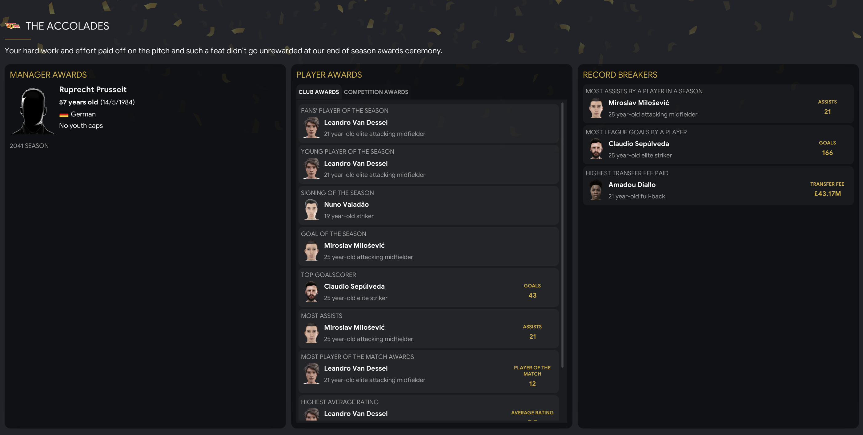That saw Union finish in a respectable 4th place, with a league-high 80 goals and 30 conceded. While 10 German teams, more than half the league, qualified for Europe this season! Sepúlveda was again Bundesliga top scorer with 28 goals in 32 games, Van Dessel had the top average rating of 7.69, topped the assists chart with 17 followed by Milosevic with 14 and got a league-high eight player of the match awards.