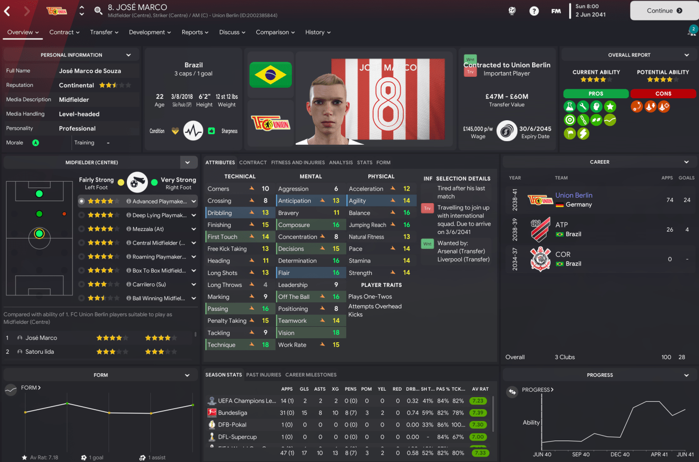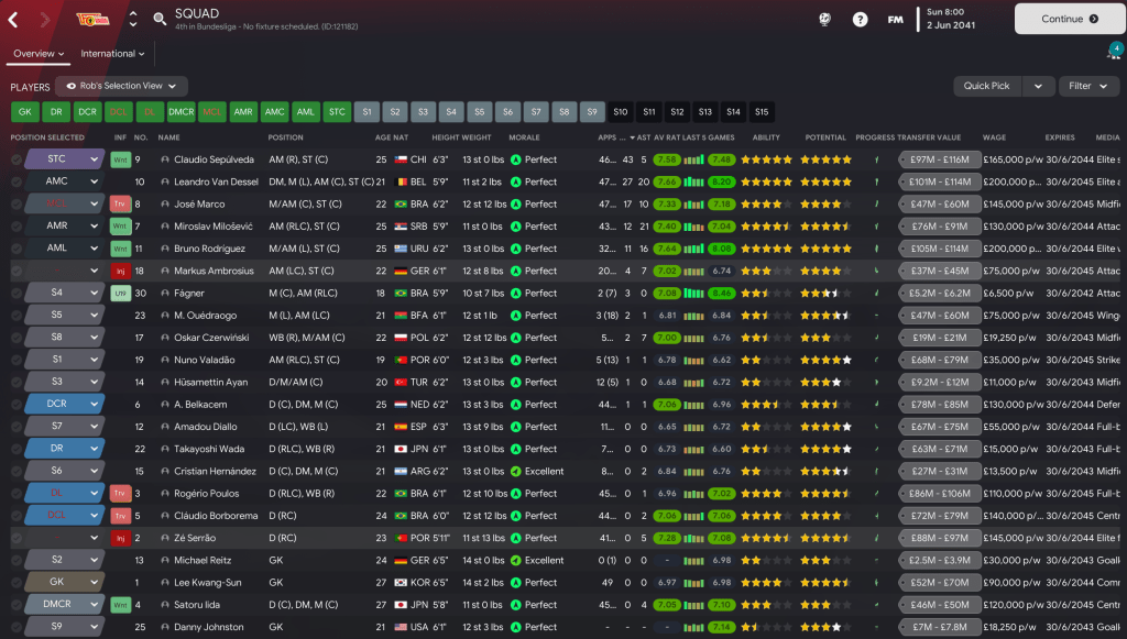 Union began 2041 with a trip to relegation-threatened Mainz and won 4-1 with braces by left winger Bruno Rodríguez and midfielder José Marco. They then had consecutive 5-1 wins at Nürnber, in which José Marco scored two more, and at bottom-side Schalke, in which he scored and got two assists, which showed signs that the real Union could be back. In fact, those three wins moved them to within nine points of the top of the league.
