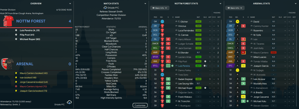 We put the Barca disappointment behind us with a Pereira brace inspiring a 2-0 win over Man UFC in the FA Cup quarter-finals. And Ellender’s goal eased us into the FA Cup Final, which could be our final match as Forest manager. We had a few injuries, including Post and Wilson, but a rare Schade goal before Arias struck from close range was enough for a narrow 2-1 victory in a really poor match. And that’s our 6th FA Cup win of the save.