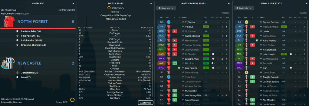 We began the season with more silverware as a Pereira brace defeated Arsenal 2-1 in the Community Shield. Ten days later we faced Newcastle in the UEFA Super Cup and a Post brace led a dominant 5-2 to win our 6th Super Cup, a new record 7 victories for Forest, and my 49th trophy at the club.
