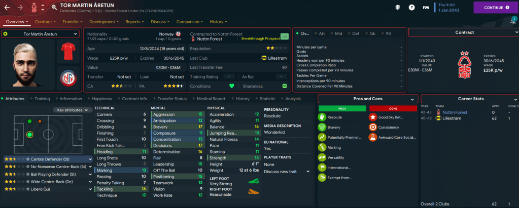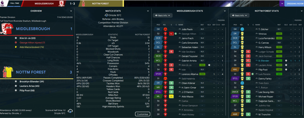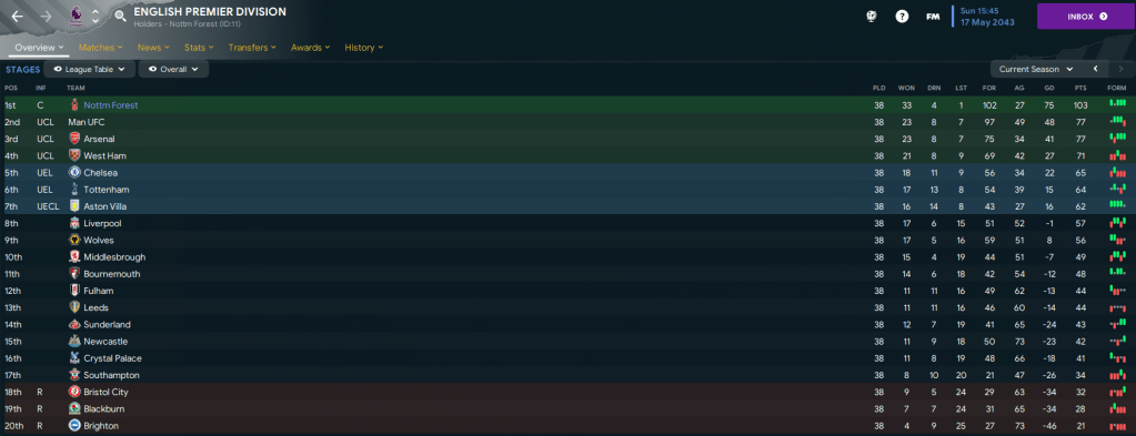 A tough run of games continued as Chelsea and Spurs visited Brian Clough Arena in the first 4 days of 2043. But they were dispatched 4-1 and 1-0 to move us 7 points clear before Tronchin scored his first goal in a 3-0 win at Southampton to extend that lead to 10 points having played one game more. That sent us on a mad run of 9 successive league wins, including Post scoring the only goal at Arsenal, to move 17 points clear with 6 games remaining. And we wrapped up the title with an easy 3-1 win at Middlesbrough, which was my 50th trophy in charge of Forest.